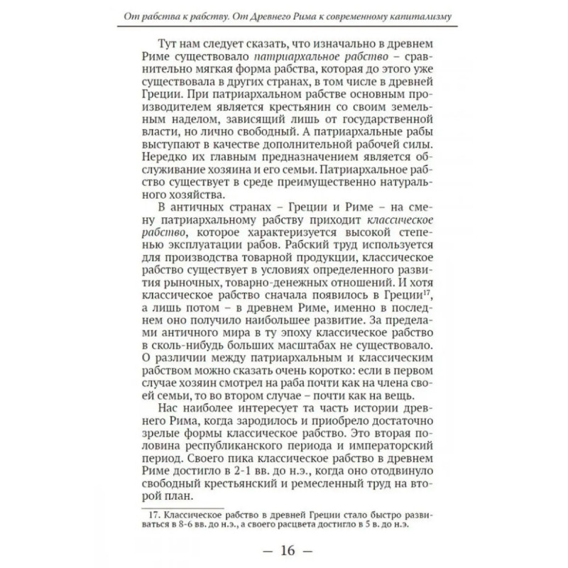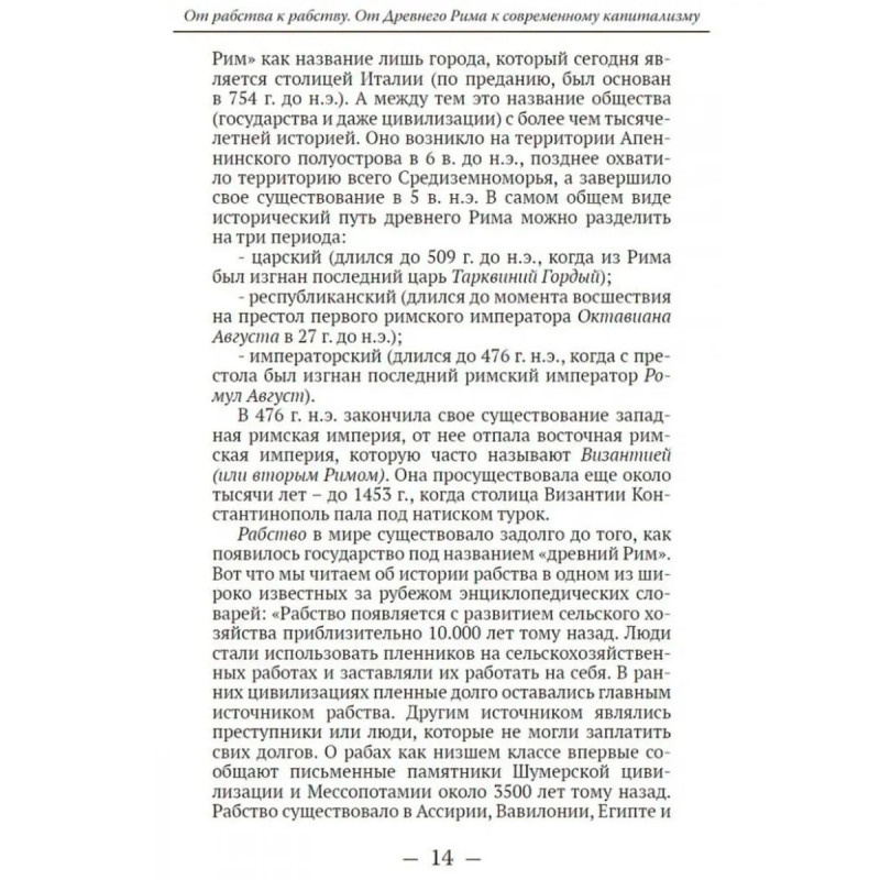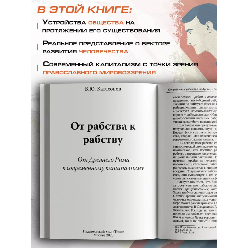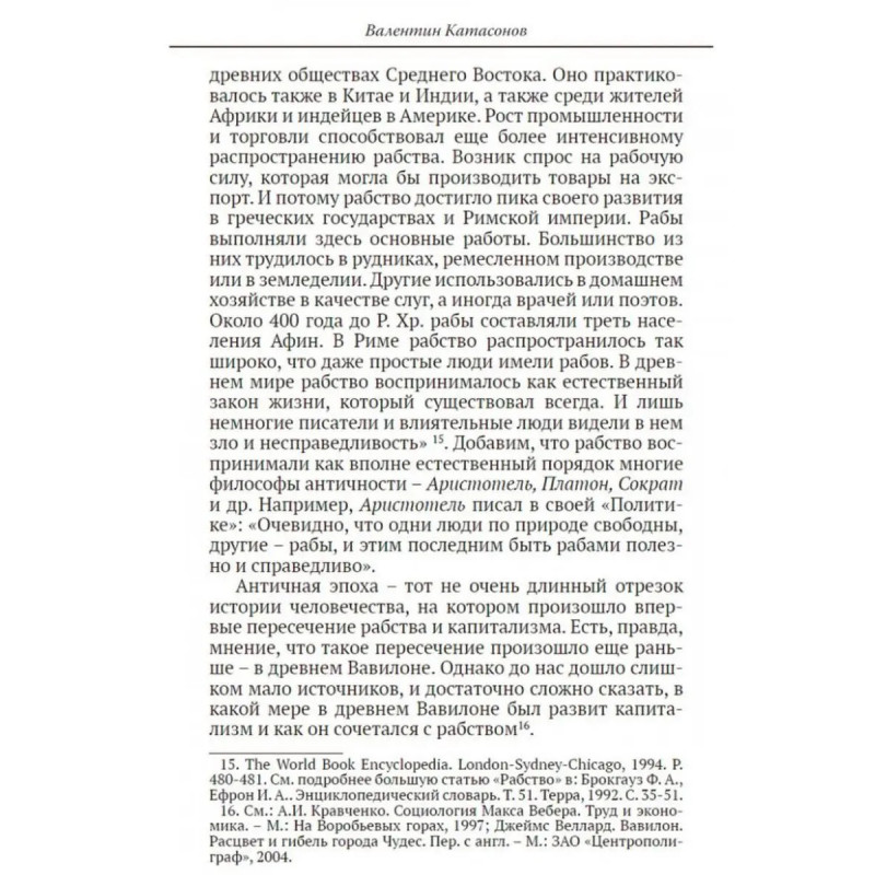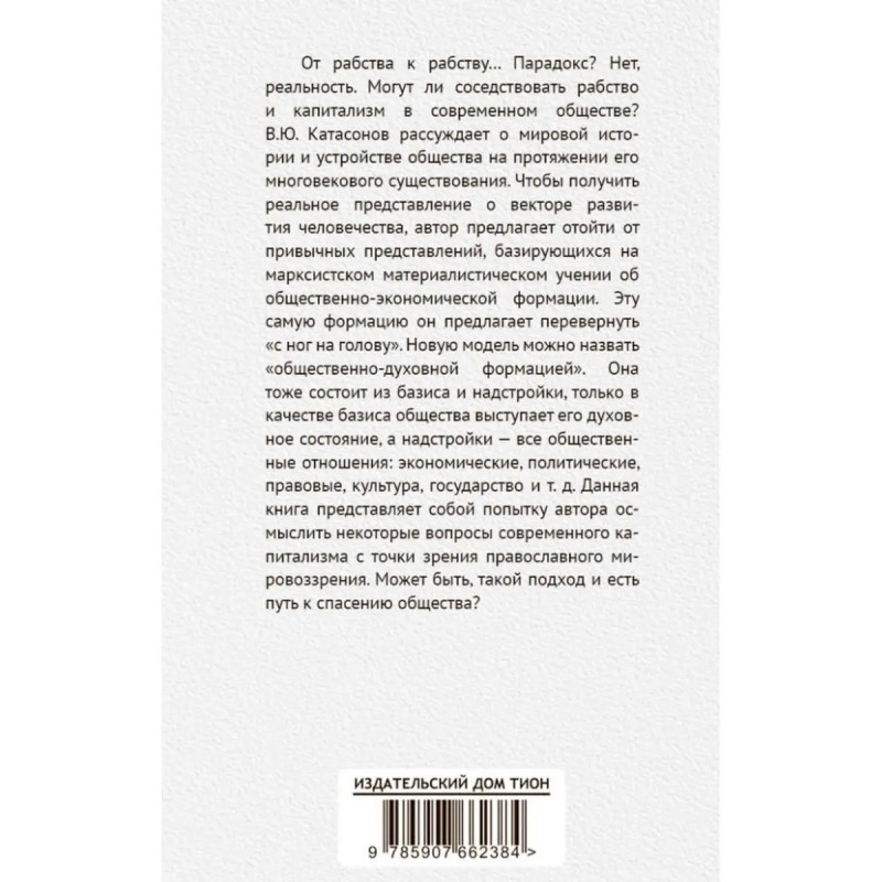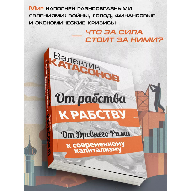 От рабства к рабству. От Древнего Рима к современному капитализму. Катасонов В.Ю. От рабства к рабству Парадокс? Нет, реальность. Могут ли соседствовать рабство и капитализм в современном обществе? В.Ю. Катасонов рассуждает о мировой истории и устройстве общества на протяжении его многовекового существования. Чтобы получить реальное представление о векторе развития человечества, автор предлагает отойти от привычных представлений, базирующихся на марксистском материалистическом учении об общественно-экономической формации. Эту самую формацию он предлагает перевернуть "с ног на голову". Новую модель можно назвать "общественно-духовной формацией". Она тоже состоит из базиса и надстройки, только в качестве базиса общества выступает его духовное состояние, а надстройки все общественные отношения: экономические, политические, правовые, культура, государство и т. д. Данная книга представляет собой попытку автора осмыслить некоторые вопросы современного капитализма с точки зрения православного мировоззрения. Может быть, такой подход и есть путь к спасению общества?