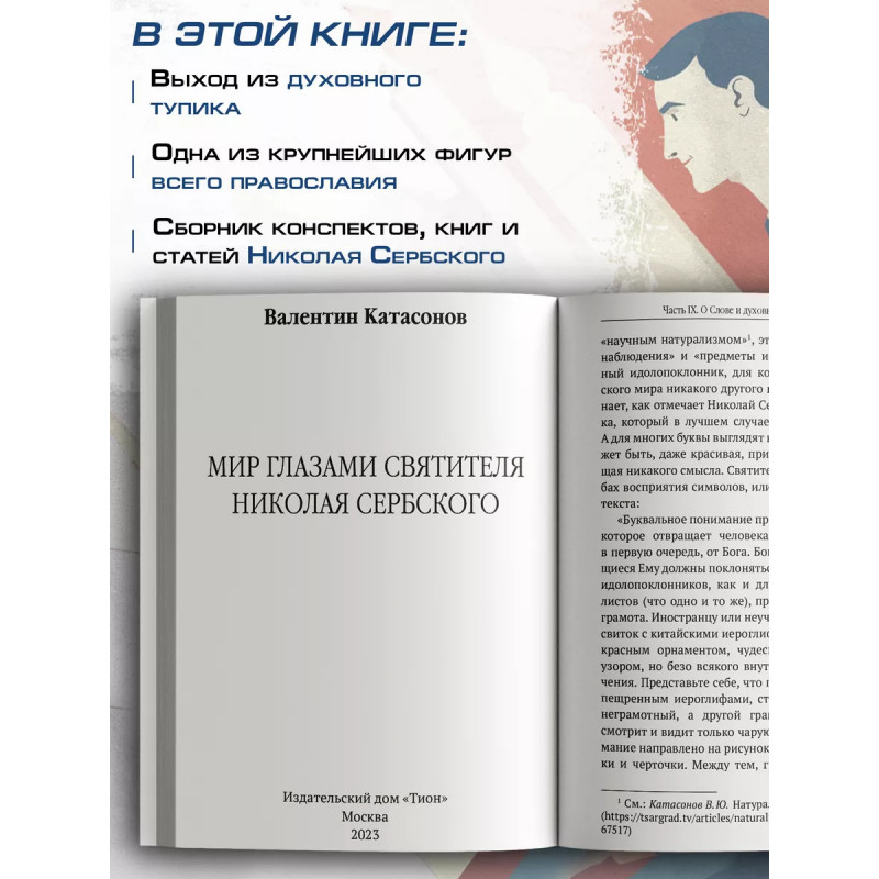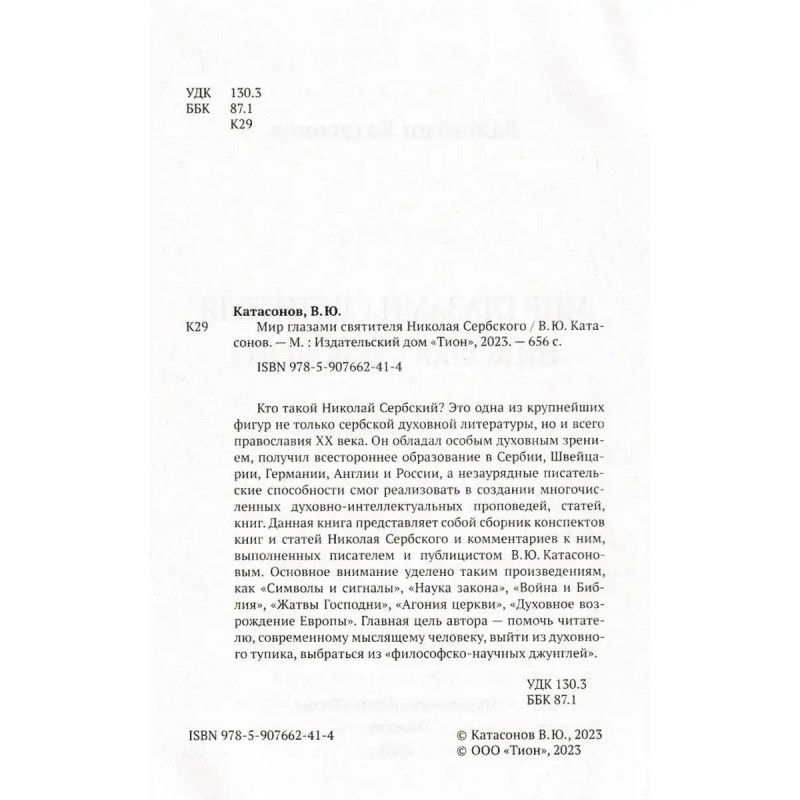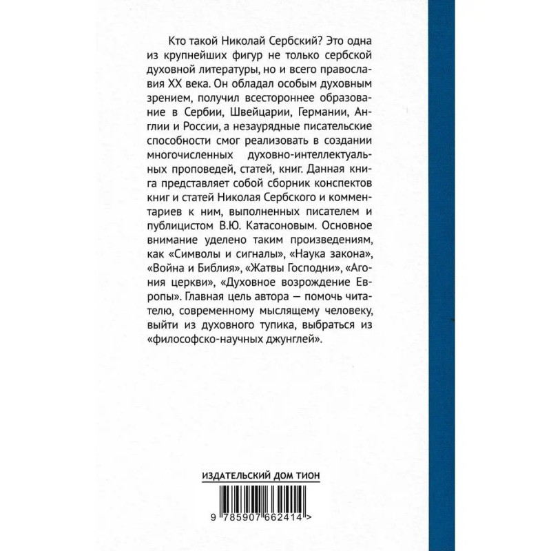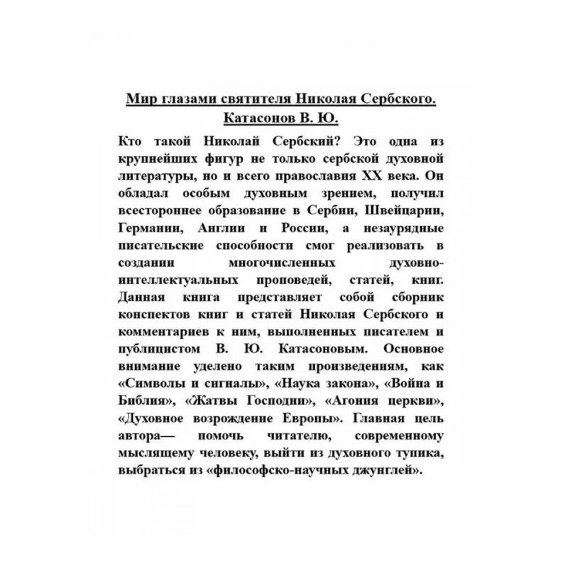 Мир глазами святителя Николая Сербского. Катасонов В.Ю. Кто такой Николай Сербский? Это одна из крупнейших фигур не только сербской духовной литературы, но и всего православия ХХ века. Он обладал особым духовным зрением, получил всестороннее образование в Сербии, Швейцарии, Германии, Англии и России, а незаурядные писательские способности смог реализовать в создании многочисленных духовно-интеллектуальных проповедей, статей, книг. Данная книга представляет собой сборник конспектов книг и статей Николая Сербского и комментариев к ним, выполненных писателем и публицистом В. Ю. Катасоновым. Основное внимание уделено таким произведениям, как "Символы и?сигналы", "Наука закона", "Война иБиблия", "Жатвы Господни", "Агония церкви", "Духовное возрождение Европы". Главная цель автора помочь читателю, современному мыслящему человеку, выйти из духовного тупика, выбраться из "философско-научных джунглей".
