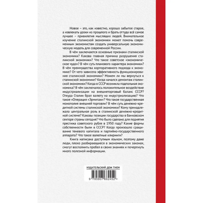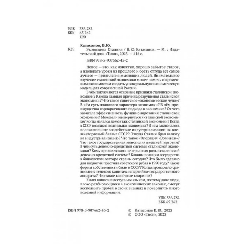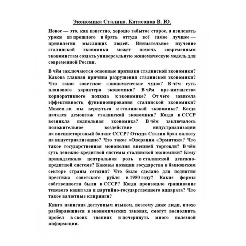 Экономика Сталина. Катасонов В.Ю. Новое это, как известно, хорошо забытое старое, а извлекать уроки из прошлого и брать оттуда всё самое лучшее привилегия мыслящих людей. Внимательное изучение сталинской экономики может помочь современным экономистам создать универсальную экономическую модель для современной России.В чём заключаются основные признаки сталинской экономики? Какова главная причина разрушения сталинской экономики? Что такое советское "экономическое чудо"? В чём суть планового характера экономики? В чём пре-имущества корпоративного подхода к экономике? От чего зависела эффективность функционирования сталинской экономики? Можем ли мы вернуться к сталинской экономике? Когда начался демонтаж сталинской экономики? Когда в СССР возникла подпольная экономика? В чём заключалось положительное воздействие индустриализации на внешнеторговый баланс СССР? Откуда Сталин брал валюту на индустриализацию? Что такое "Операция "Эрмитаж"? Что такое государственная монополия внешней торговли? В чём суть денежно-кредитной системы сталинской экономики? Кому принадлежала центральная роль в сталинской денежно-кредитной системе? Каковы позиции государства в банковском секторе страны сегодня? Что было сделано для поднятия престижа советского рубля в 1950 году? Какие формы собственности были в СССР? Когда произошло сращивание теневого капитала и партийно-государственного аппарата? Что такое валютные клиринги?Книга написана доступным языком, поэтому даже люди, плохо разбирающиеся в экономических законах, смогут восполнить пробел в своих знаниях и почерпнуть много полезной информации.