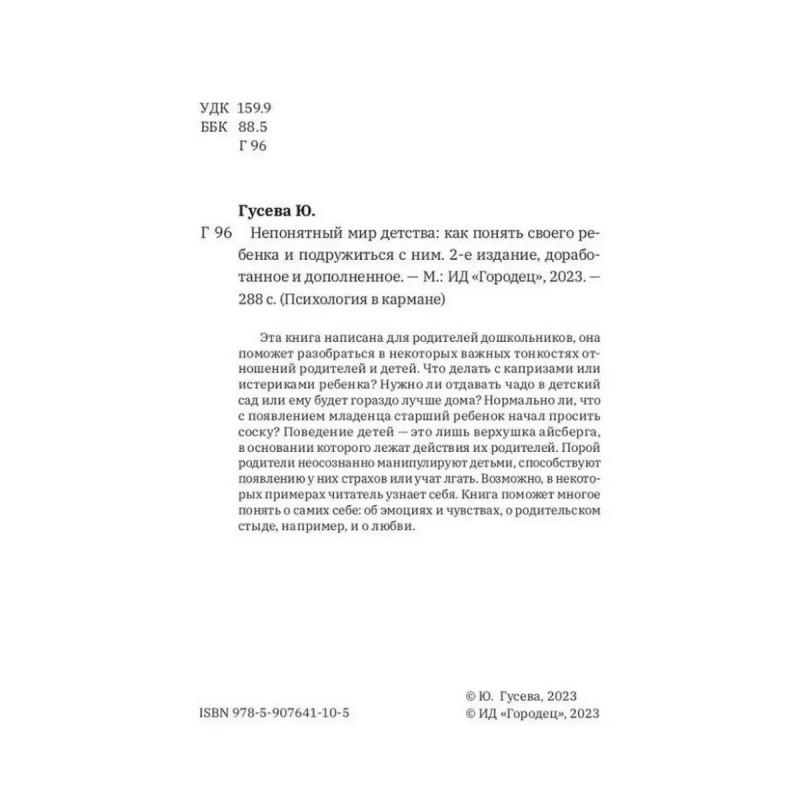 Непонятный мир детства: как понять своего ребёнка и подружиться с ним. Гусева Ю.Е. Второе издание бестселлера, доработанное и дополненное! Эта книга написана для родителей дошкольников, она поможет разобраться в некоторых важных тонкостях отношений родителей и детей.Что делать с капризами или истериками ребенка?Нужно ли отдавать чадо в детский сад или ему будет гораздо лучше дома?Нормально ли, что с появлением младенца старший ребенок начал просить соску?Поведение детей это лишь верхушка айсберга, в основании которого лежат действия их родителей. Порой родители неосознанно манипулируют детьми, способствуют появлению у них страхов или учат лгать. Возможно, в некоторых примерах читатель узнает себя. Книга поможет многое понять о самих себе: об эмоциях и чувствах, о родительском стыде, например, и о любви.Гусева Юлия Евгеньевна практикующий психолог, кандидат психологических наук, доцент кафедры общей и социальной психологии Российского государственного университета им. А.И. Герцена, Санкт-Петербург.