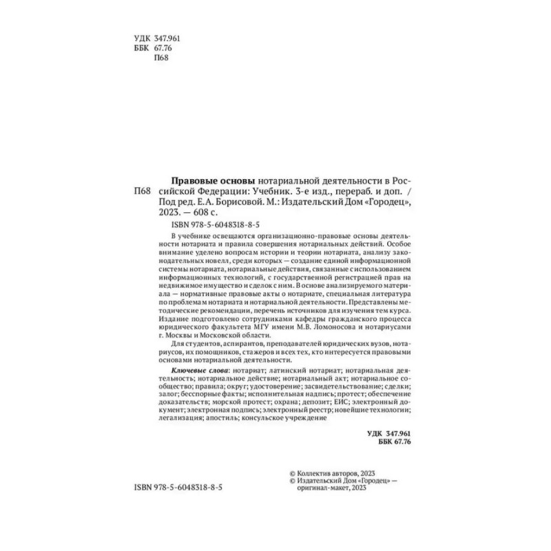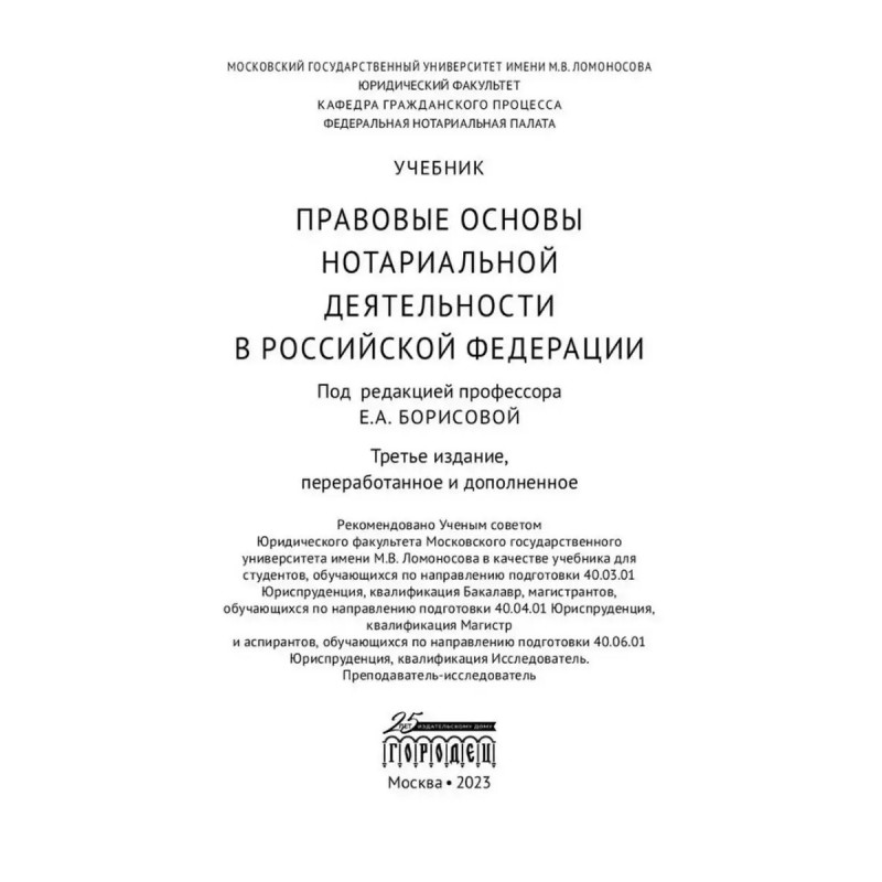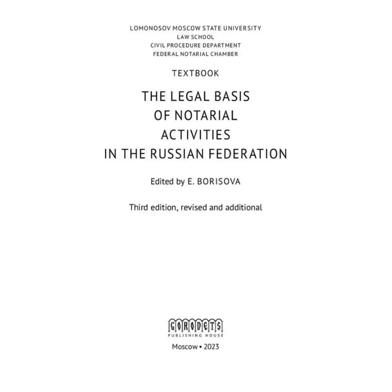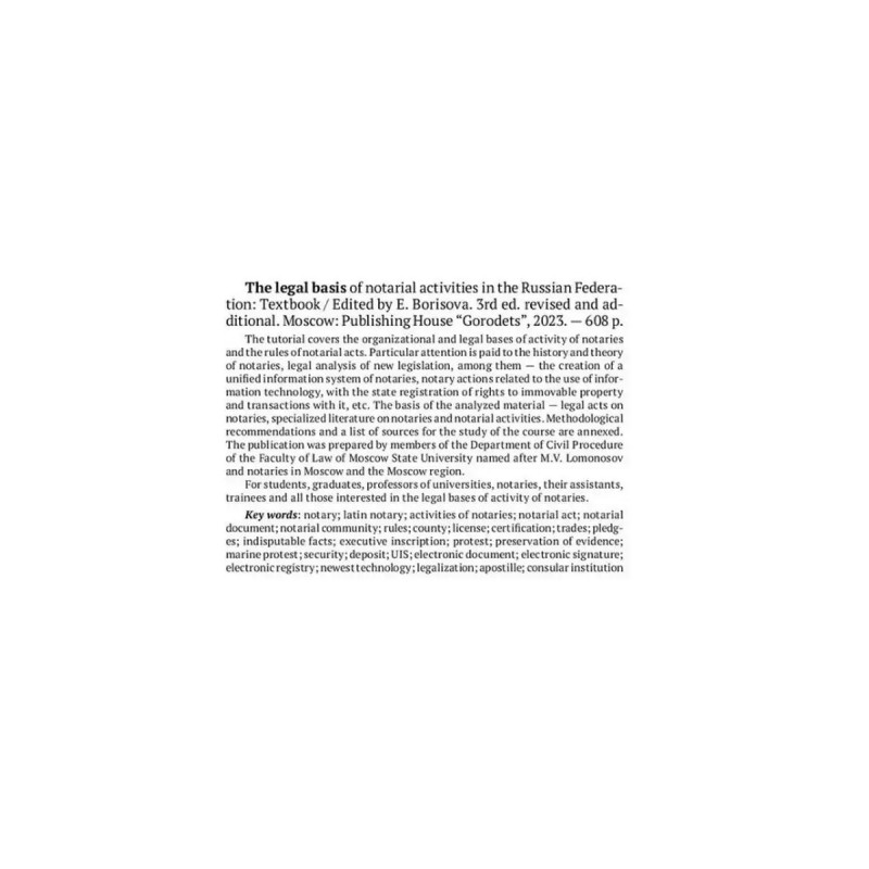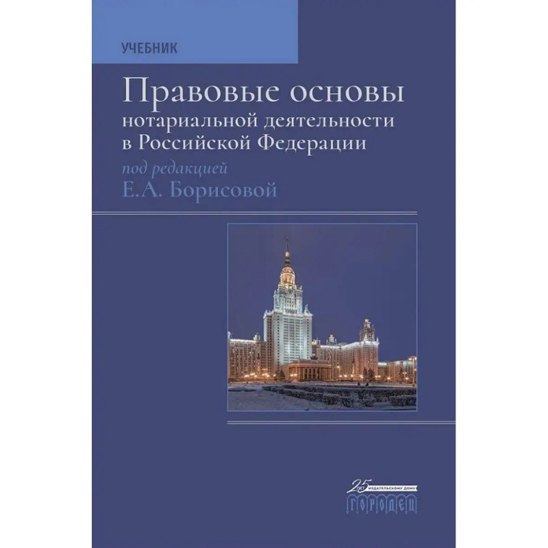 Правовые основы нотариальной деятельности в РФ. Борисова Е.А. В учебнике освещаются организационно-правовые основы деятельности нотариата и правила совершения нотариальных действий. Особое внимание уделено вопросам истории и теории нотариата, анализу законодательных новелл, среди которых - создание единой информационной системы нотариата, нотариальные действия, связанные с использованием информационных технологий, с государственной регистрацией прав на недвижимое имущество и сделок с ним. В основе анализируемого материала - нормативные правовые акты о нотариате, специальная литература по проблемам нотариата и нотариальной деятельности. Представлены методические рекомендации, перечень источников для изучения тем курса. Издание подготовлено сотрудниками кафедры гражданского процесса юридического факультета МГУ имени М.В. Ломоносова и нотариусами г. Москвы и Московской области.Для студентов, аспирантов, преподавателей юридических вузов, нотариусов, их помощников, стажеров и всех тех, кто интересуется правовыми основами нотариальной деятельности.