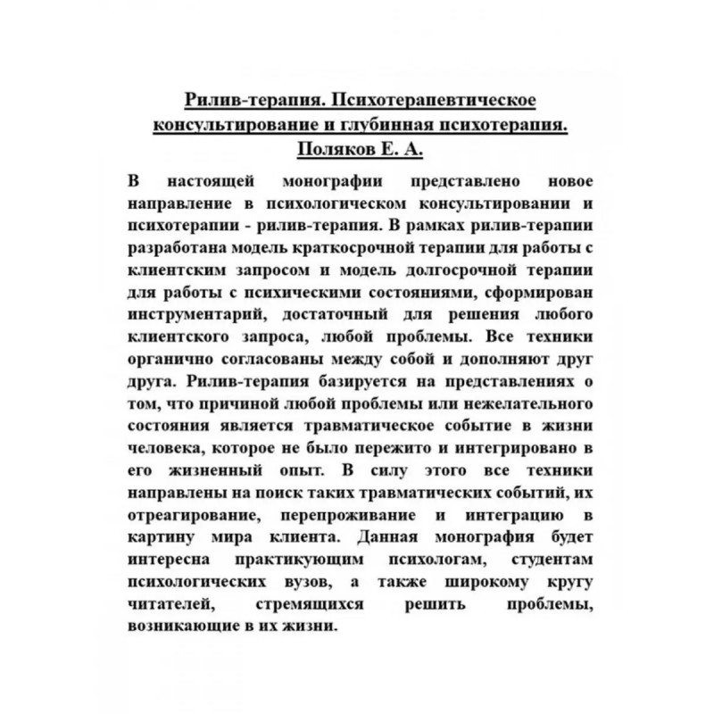 Рилив-терапия. Психотерапевтическое консультирование и глубинная психотерапия. Поляков Е. А. В настоящей монографии представлено новое направление в психологическом консультировании и психотерапии - рилив-терапия. В рамках рилив-терапии разработана модель краткосрочной терапии для работы с клиентским запросом и модель долгосрочной терапии для работы с психическими состояниями, сформирован инструментарий, достаточный для решения любого клиентского запроса, любой проблемы. Все техники органично согласованы между собой и дополняют друг друга. Рилив-терапия базируется на представлениях о том, что причиной любой проблемы или нежелательного состояния является травматическое событие в жизни человека, которое не было пережито и интегрировано в его жизненный опыт. В силу этого все техники направлены на поиск таких травматических событий, их отреагирование, перепроживание и интеграцию в картину мира клиента. Данная монография будет интересна практикующим психологам, студентам психологических вузов, а также широкому кругу читателей, стремящихся решить проблемы, возникающие в их жизни.