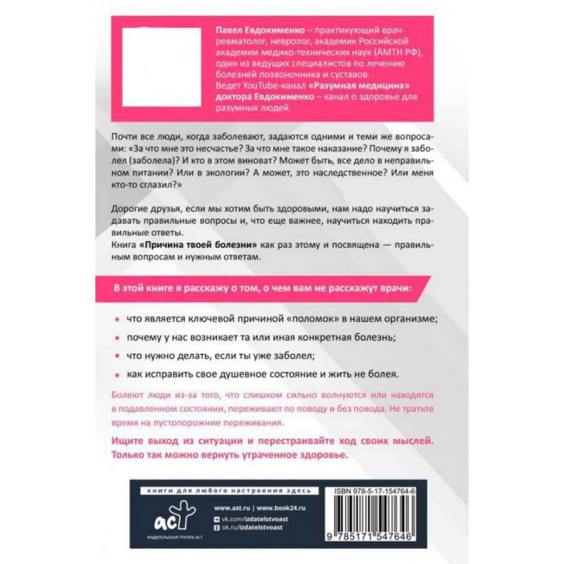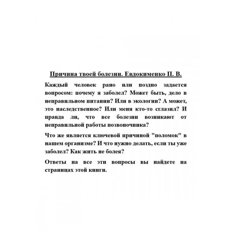 Причина твоей болезни. Евдокименко П. В. Причина твоей болезни. Евдокименко П. В. Каждый человек рано или поздно задается вопросом: почему я заболел? Может быть, дело в неправильном питании? Или в экологии? А может, это наследственное? Или меня кто-то сглазил? И правда ли, что все болезни возникают от неправильной работы позвоночника?Что же является ключевой причиной "поломок" в нашем организме? И что нужно делать, если ты уже заболел? Как жить не болея?Ответы на все эти вопросы вы найдете на страницах этой книги.