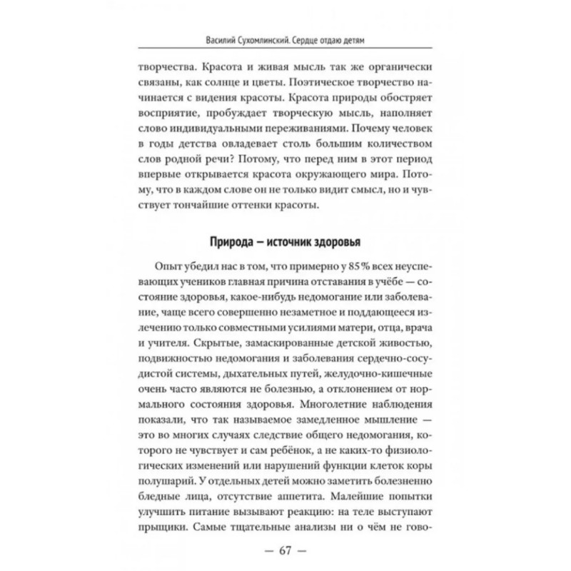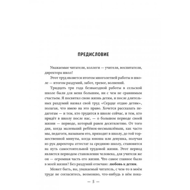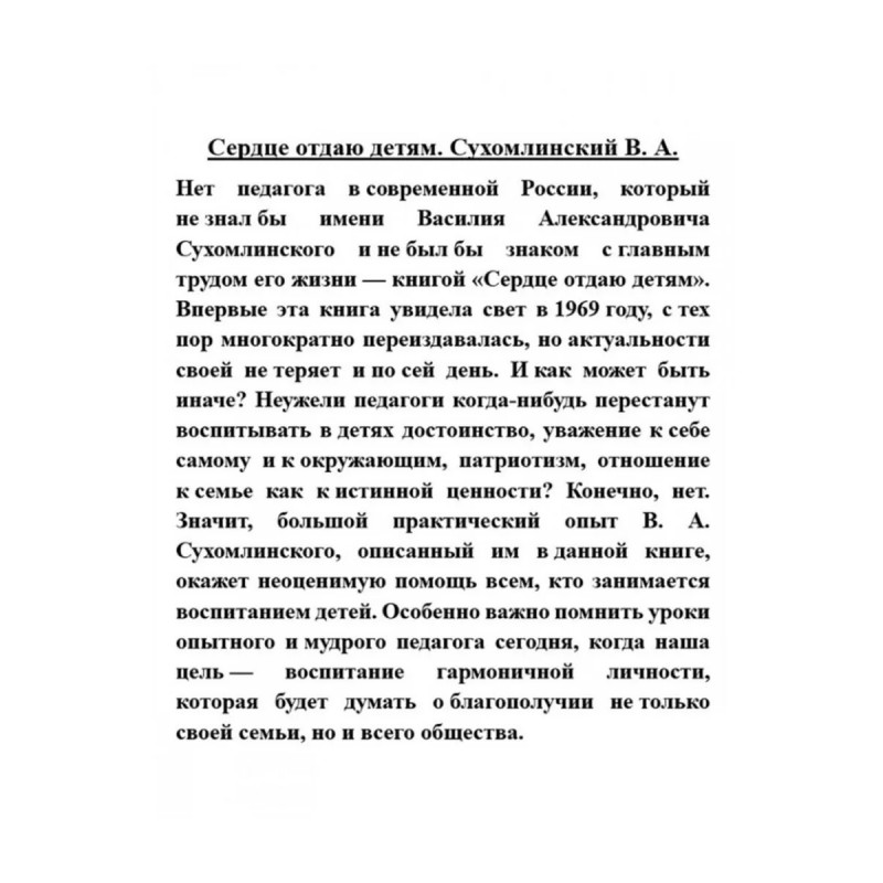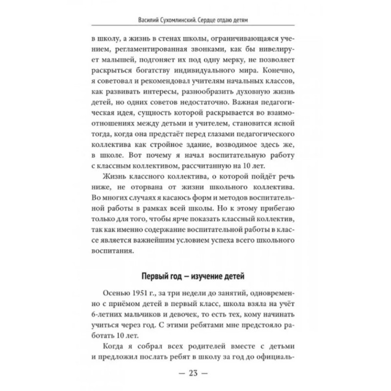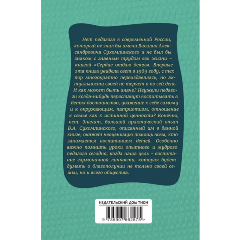 Сердце отдаю детям. Сухомлинский В.А. Нет педагога в современной России, который не знал бы имени Василия Александровича Сухомлинского и не был бы знаком с главным трудом его жизни книгой "Сердце отдаю детям". Впервые эта книга увидела свет в 1969 году, с тех пор многократно переиздавалась, но актуальности своей не теряет и по сей день. И как может быть иначе? Неужели педагоги когда-нибудь перестанут воспитывать в детях достоинство, уважение к себе самому и к окружающим, патриотизм, отношение к семье как к истинной ценности? Конечно, нет. Значит, большой практический опыт В. А. Сухомлинского, описанный им в данной книге, окажет неоценимую помощь всем, кто занимается воспитанием детей. Особенно важно помнить уроки опытного и мудрого педагога сегодня, когда наша цель воспитание гармоничной личности, которая будет думать о благополучии не только своей семьи, но и всего общества.