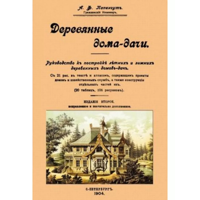 Деревянные дома-дачи. Папенгут А. Ф. Репринт с издания. СПб., 1904. Руководство к постройке летних и зимних деревянных домов-дач. С 21 рисунком в тексте и атласом, содержащим проекты домов и хозяйственных служб, а также конструкции отдельных частей их. (20 таблиц 106 рисунков). Издание 2-е, исправленное и значительно дополненное.