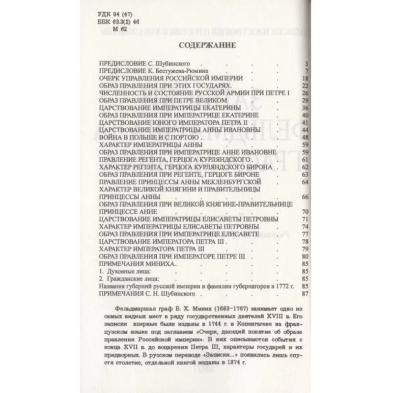 Записки фельдмаршала графа Миниха. (время 1682-1762) Петр I, Екатерина I, Петр II, Анна I Иоанновна, Петр III. Миних Х. А. Граф Бурхард Кристоф фон Мюнних (в России - Христофор Антонович Миних; 1683 - 1767) - российский генерал-фельдмаршал немецкого происхождения, отец мемуариста Иоганна Эрнста Миниха. В 1700-1720 годах он служил инженером во французской, гессен-дармштадтской, гессен-кассельской и польско-саксонской армиях. В 1721 году прибыл в Россию вести инженерные дела, задуманные Петром I. В 1722 году был произведён в генерал-лейтенанты, в 1726 году, уже при Екатерине I, - в генерал-аншефы. В 1727 году император Пётр II, переехавший со своим двором в Москву, назначает Миниха правителем Петербурга. C 1728 он - граф, генерал-губернатор Ингерманландии, Карелии и Финляндии (до 1734 года). После восшествия на престол Анны Иоанновны Христофор Антонович в короткое время (1730-1732) был пожалован генерал-фельдцейхмейстером, президентом Военной коллегии, а 25 февраля (7 марта) 1732 года - генерал-фельдмаршалом. Руководил осадой Данцига (1734 г.). Главнокомандующий Русско-турецкая война (1735-1739). С 1740 Первый министр по военным, гражданским и дипломатическим делам. В 1741 году, с воцарением Елизаветы Петровны, Миних был предан суду и сослан в Сибирь. Через 20 лет, в 1762 году, новый император Пётр III возвратил 78-летнего Миниха в Петербург, вернув ему все чины и награды и включив в Императорский совет. В последние годы был назначен губернатором Сибири (с проживанием в Петербурге). Тираж 30 экз. выполнен по технологии print-on-demand.