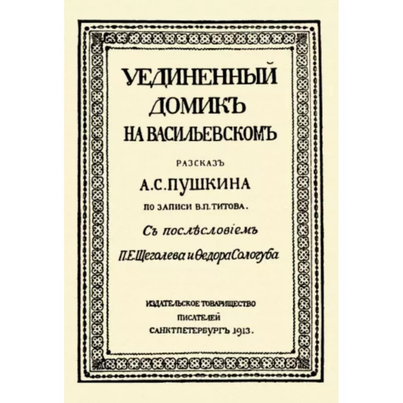Уединённый домик на Васильевском. Рассказ А.С. Пушкина. Титов В.П. Это история о бесе, влюбленном в ангельскую девушку. "Уединенный домик на Васильевском" - фантастическая повесть Владимира Титова, созданная по сюжету Александра Пушкина. В 1828 году Пушкин в салоне у Карамзиных рассказал мистическую повесть. Присутствовавший на вечере Титов впоследствии записал её и с разрешения Пушкина опубликовал.Владимир Павлович Титов (1807 - 1891) - русский писатель, чиновник, дипломат, действительный тайный советник. Племянник министра юстиции Д. В. Дашкова. Он исполнял обязанности генерального консула в Дунайских княжествах (1839) и посланника в Константинополе.Репринт с издания. Спб., 1913.