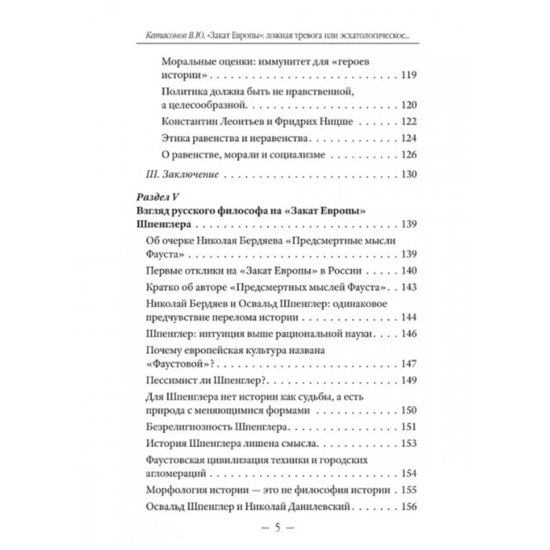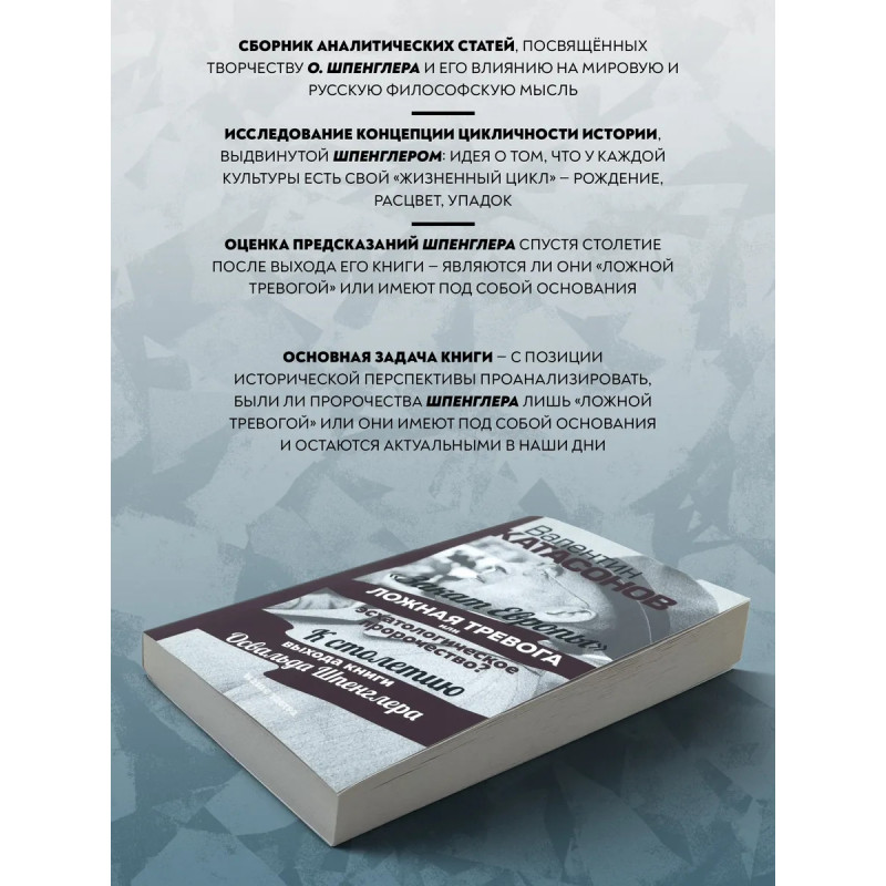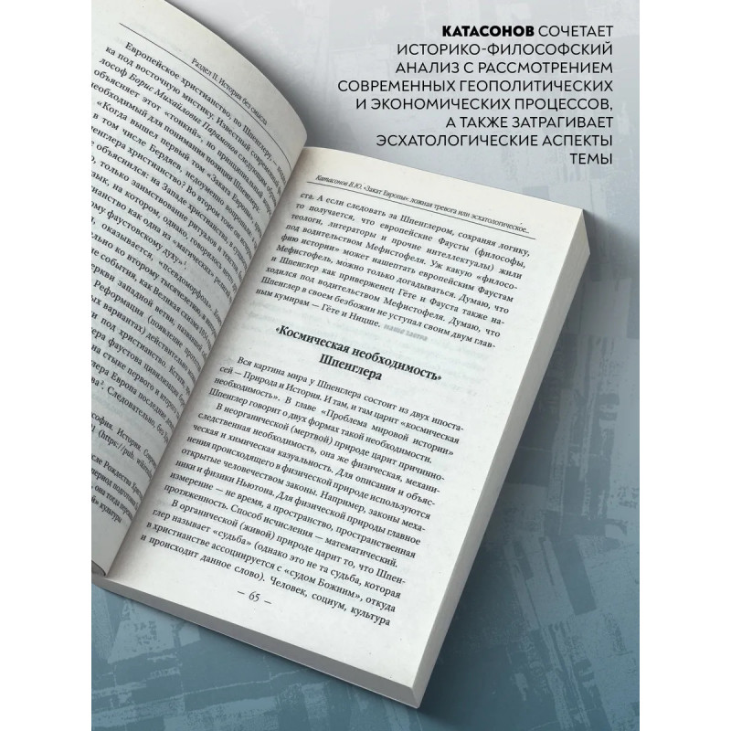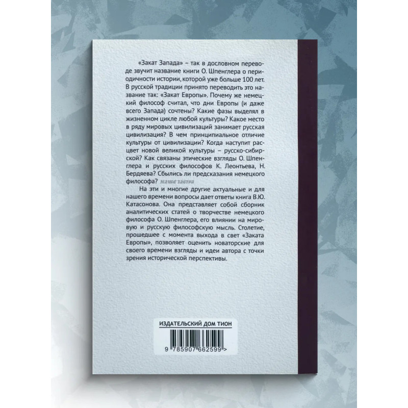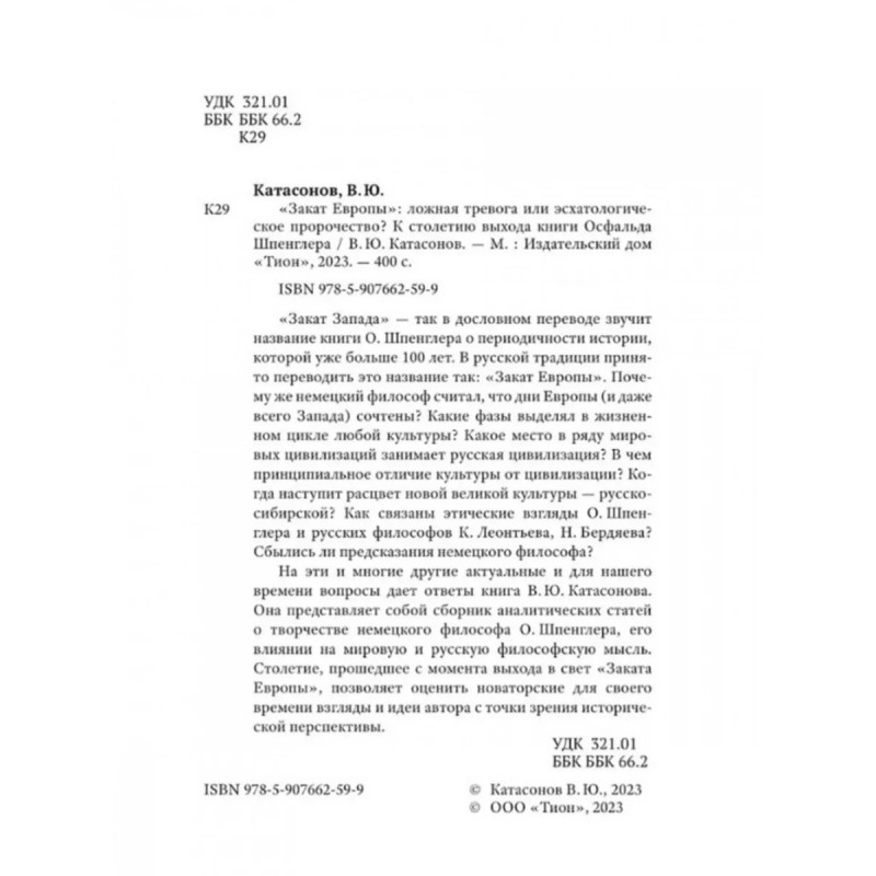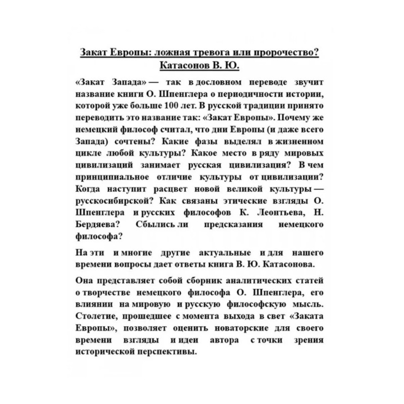 Закат Европы: ложная тревога или пророчество? Катасонов В.Ю. "Закат Запада" так в дословном переводе звучит название книги О. Шпенглера о периодичности истории, которой уже больше 100 лет. В русской традиции принято переводить это название так: "Закат Европы". Почему же немецкий философ считал, что дни Европы (и даже всего Запада) сочтены? Какие фазы выделял в жизненном цикле любой культуры? Какое место в ряду мировых цивилизаций занимает русская цивилизация? В чем принципиальное отличие культуры от цивилизации? Когда наступит расцвет новой великой культуры русскосибирской? Как связаны этические взгляды О. Шпенглера и русских философов К. Леонтьева, Н. Бердяева? Сбылись ли предсказания немецкого философа?На эти и многие другие актуальные и для нашего времени вопросы дает ответы книга В. Ю. Катасонова.Она представляет собой сборник аналитических статей о творчестве немецкого философа О. Шпенглера, его влиянии на мировую и русскую философскую мысль. Столетие, прошедшее с момента выхода в свет "Заката Европы", позволяет оценить новаторские для своего времени взгляды и идеи автора с точки зрения исторической перспективы.