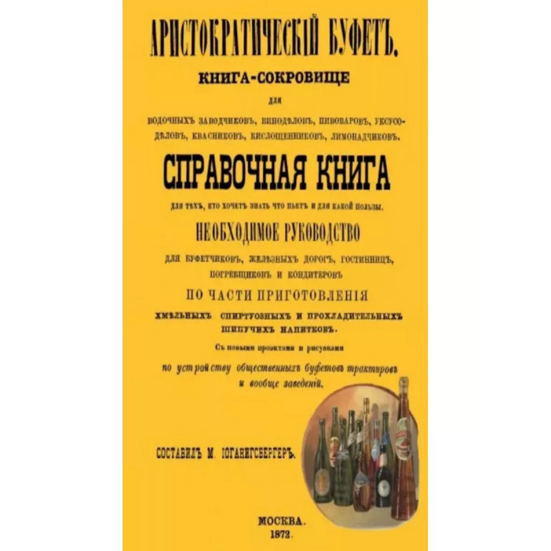 Аристократический буфет. Иоганигсбергер М. Репринт с издания. Книга-сокровище для водочных заводчиков, виноделов, пивоваров, уксусоделов, квасников, кислощенников, лимонадчиков. Справочная книга для тех, кто хочет знать, что пьет и для какой пользы. Необходимое руководство буфетчиков, железных дорог, гостинниц, погребщиков и кондитеров почасти приготовления хмельных, спиртуозных и прхладительных шипучих напитков. С новыми проектами и рис. по устройству общественных буфетов, трактиров и вообще заведений. Москва. Тип. М.П. Погодина, 1872.Книга изготовлена по технологии "печать по требованию". Тираж 30 экз.