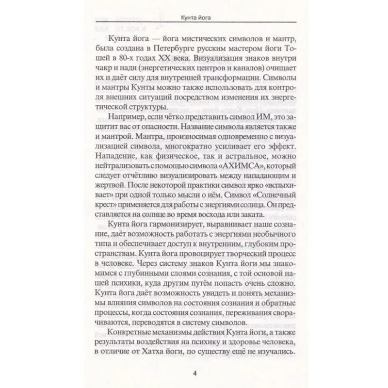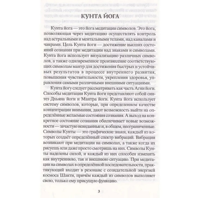 "Кунта йога" представляет собой синтез нескольких учений йоги. Кунта йога - это система символов, которые при определенном качестве концентрации внимания дают возможность выйти на то или иное состояние сознания, что обеспечивает новые возможности - зачастую невиданные и, в общем, неограниченные. Она учит работать с чакрами. Основное внимание в практике уделяется созерцанию архетипических символов. Некоторым символам сопутствуют мантры, произнесение которых усиливает эффект практики. Каждый символ несёт в себе определённое качество энергии, вибрацию и может использоваться в различных ситуациях повседневной жизни.