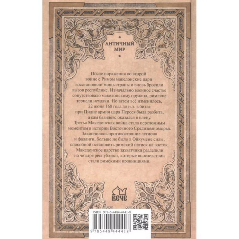 Гибель Македонского царства. Елисеев М. Б. После поражения во второй войне с Римом македонские цари восстановили мощь страны и вновь бросили вызов республике. Изначально военное счастье сопутствовало македонскому оружию, римляне терпели неудачи. Но затем всё изменилось, 22 июня 168 года до н. э. в битве при Пидне армия царя Персея была разбита, а сам базилевс оказался в плену. Третья Македонская война стала переломным моментом в истории Восточного Средиземноморья. Закончилось противостояние легиона и фаланги, больше не было в Ойкумене силы, способной остановить римский натиск на восток. Македонское царство захватчики разделили на четыре республики, которые впоследствии стали римскими провинциями.