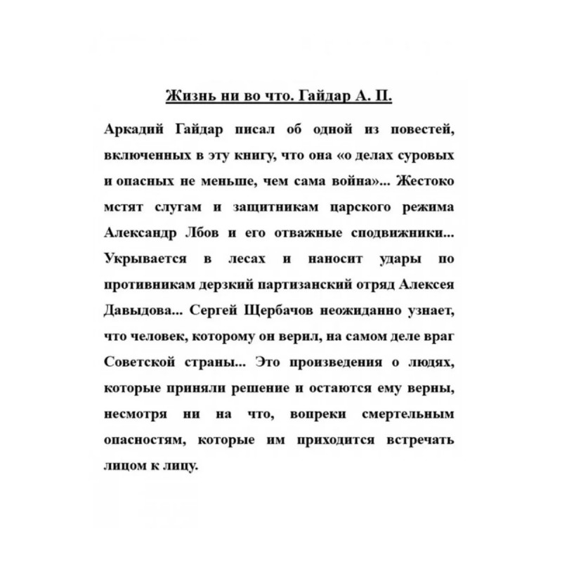 Жизнь ни во что. Гайдар А. П. Аркадий Гайдар писал об одной из повестей, включенных в эту книгу, что она "о делах суровых и опасных не меньше, чем сама война"... Жестоко мстят слугам и защитникам царского режима Александр Лбов и его отважные сподвижники... Укрывается в лесах и наносит удары по противникам дерзкий партизанский отряд Алексея Давыдова... Сергей Щербачов неожиданно узнает, что человек, которому он верил, на самом деле враг Советской страны... Это произведения о людях, которые приняли решение и остаются ему верны, несмотря ни на что, вопреки смертельным опасностям, которые им приходится встречать лицом к лицу.