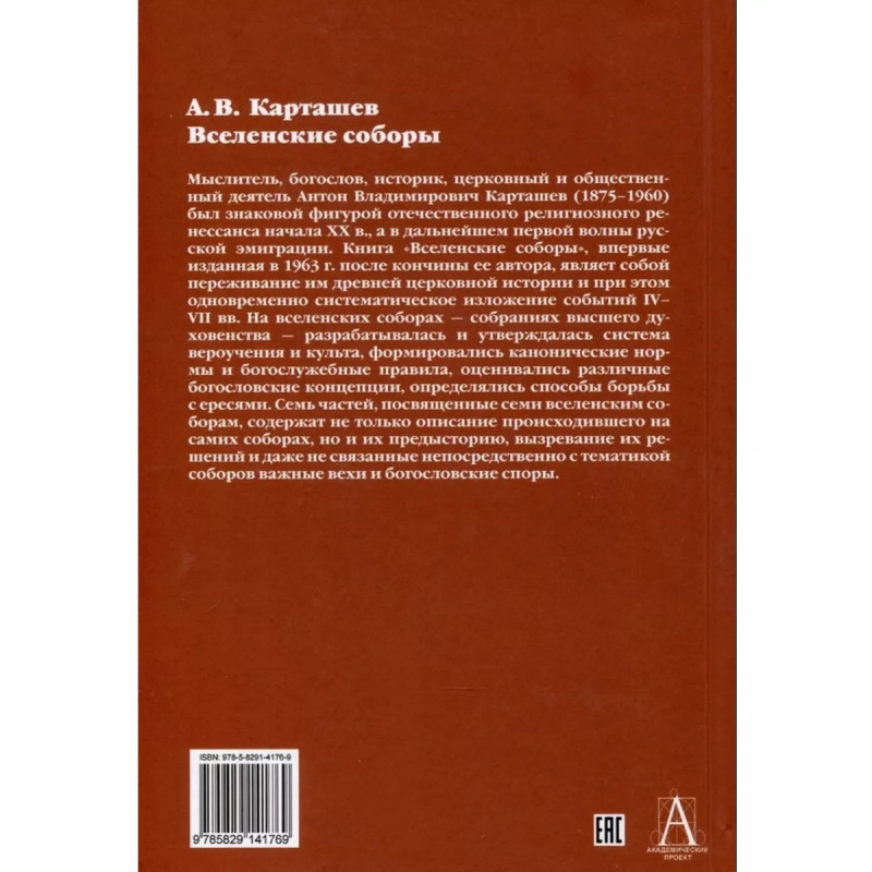 Вселенские соборы. Карташев А. В. Мыслитель, богослов, историк, церковный и общественный деятель Антон Владимирович Карташев (18751960) был знаковой фигурой отечественного религиозного ренессанса начала ХХ в., а в дальнейшем первой волны русской эмиграции. Книга Вселенские соборы, впервые изданная в 1963 г. после кончины ее автора, являет собой переживание им древней церковной истории и при этом одновременно систематическое изложение событий IVVII вв. На вселенских соборах собраниях высшего духовенства разрабатывалась и утверждалась система вероучения и культа, формировались канонические нормы и богослужебные правила, оценивались различные богословские концепции, определялись способы борьбы с ересями. Семь частей, посвященные семи вселенским соборам, содержат не только описание происходившего на самих соборах, но и их предысторию, вызревание их решений и даже не связанные непосредственно с тематикой соборов важные вехи и богословские споры. Книга будет полезна богословам, религиоведам, историкам и всем изучающим историю Церкви и ее вероучение.