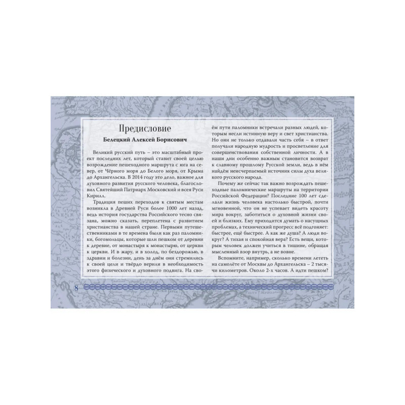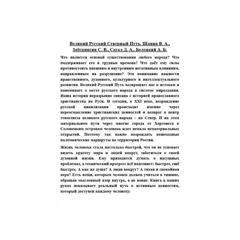 Великий Русский Северный Путь. Шанин В.А., Забурнягин С.В., Сагал Д.А., Белецкий А.Б. Что является основой существования любого народа? Что поддерживает его в трудные времена? Что даёт ему силы противостоять внешним и внутренним негативным влияниям, направленным на разрушение? Это понимание важности нравственного, духовного, культурного и интеллектуального развития. Великий Русский Путь возвращает нас к истокам и напоминает о месте русского народа в системе мироздания. Наша история неразрывно связана с историей православного христианства на Руси. И сегодня, в XXI веке, возрождение русской цивилизации происходит именно через переосмысление христианских ценностей и возврат в центр этногенеза великого русского народа на Север. И на этом материальном пути через многие города от Херсонеса к Соловецким островам человека ждет немало нематериальных открытий. Поэтому так важно возрождать пешеходные паломнические маршруты на территории России.Жизнь человека стала настолько быстрой, что он не успевает видеть красоту мира и людей вокруг, заботиться о своей духовной жизни. Ему приходится думать о насущных проблемах, а технический прогресс всё подгоняет: быстрее, ещё быстрее. А как же душа? А люди вокруг? А тихая и спокойная вера? Есть вещи, которым человек должен учиться в тишине, обращая мысленный взор внутрь, а не вовне. Книга в ваших руках показывает реальный путь к истинным ценностям, который доступен каждому человеку.