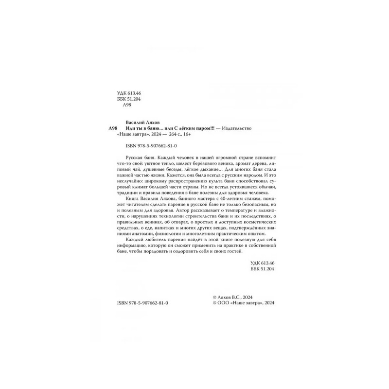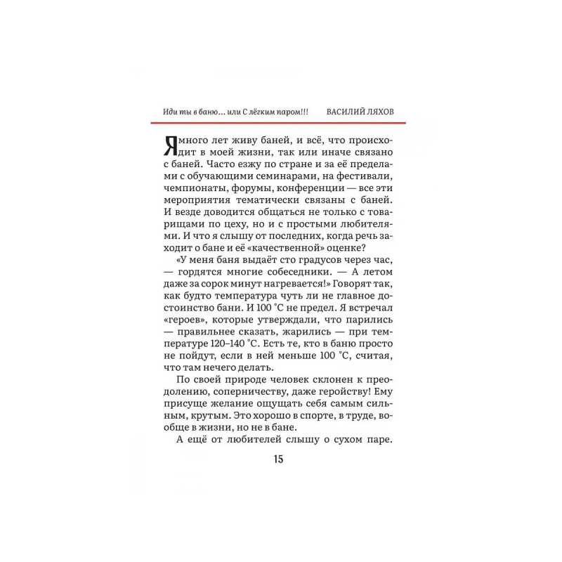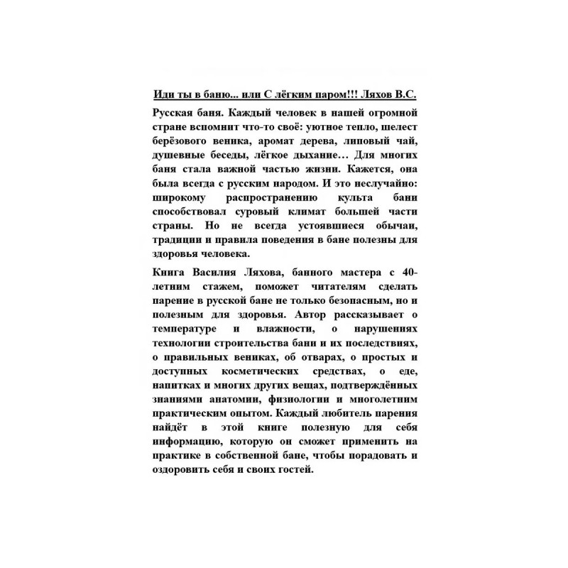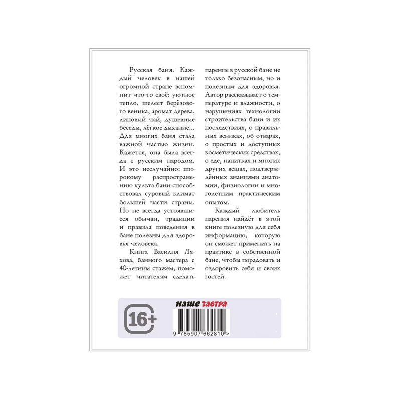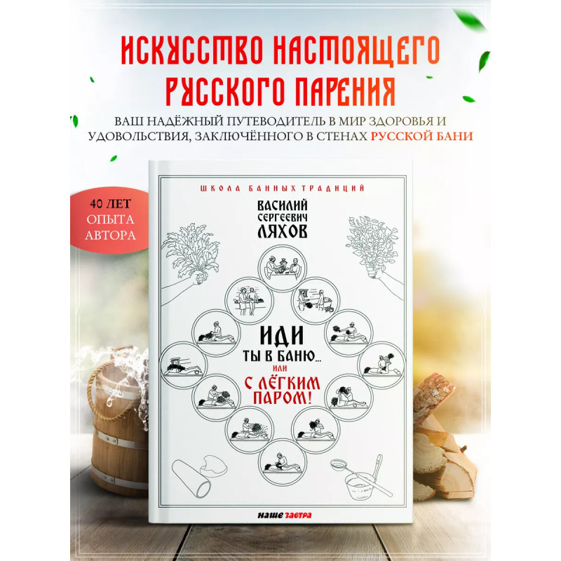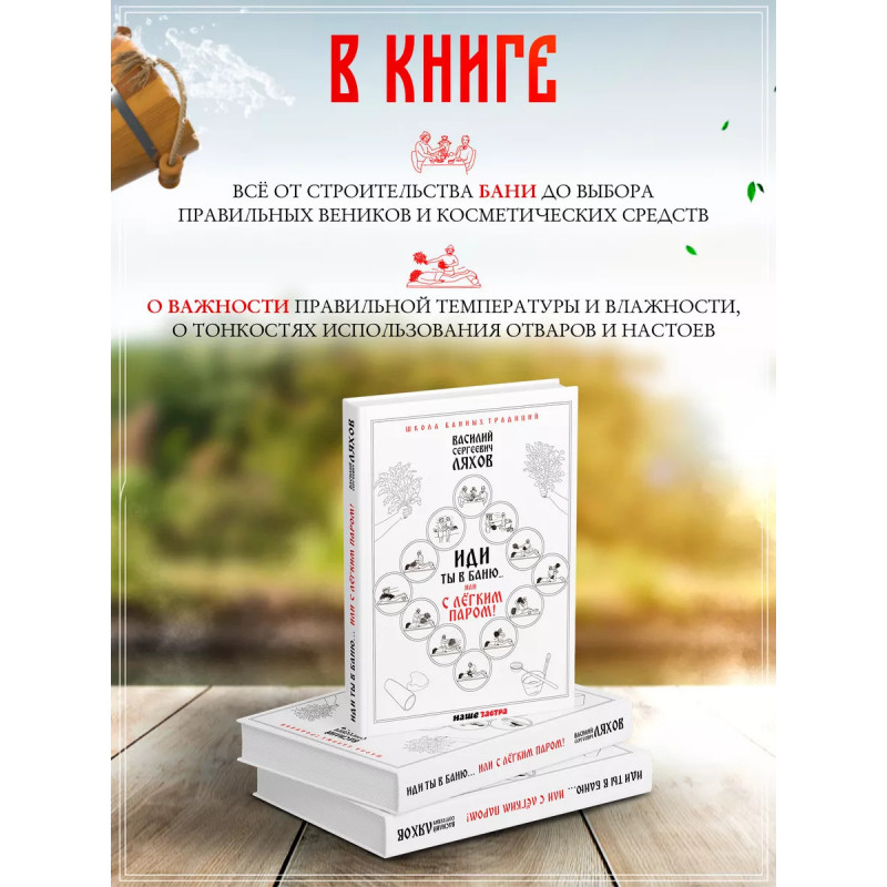 Иди ты в баню... или С лёгким паром!!! Ляхов В.С. Русская баня. Каждый человек в нашей огромной стране вспомнит что-то своё: уютное тепло, шелест берёзового веника, аромат дерева, липовый чай, душевные беседы, лёгкое дыхание Для многих баня стала важной частью жизни. Кажется, она была всегда с русским народом. И это неслучайно: широкому распространению культа бани способствовал суровый климат большей части страны. Но не всегда устоявшиеся обычаи, традиции и правила поведения в бане полезны для здоровья человека.Книга Василия Ляхова, банного мастера с 40-летним стажем, поможет читателям сделать парение в русской бане не только безопасным, но и полезным для здоровья. Автор рассказывает о температуре и влажности, о нарушениях технологии строительства бани и их последствиях, о правильных вениках, об отварах, о простых и доступных косметических средствах, о еде, напитках и многих других вещах, подтверждённых знаниями анатомии, физиологии и многолетним практическим опытом. Каждый любитель парения найдёт в этой книге полезную для себя информацию, которую он сможет применить на практике в собственной бане, чтобы порадовать и оздоровить себя и своих гостей.