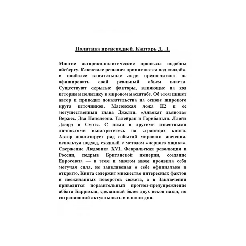 Политика преисподней. Каптарь Д.Л. Многие историко-политические процессы подобны айсбергу. Ключевые решения принимаются под "водой", и наиболее влиятельные люди предпочитают не афишировать свой реальный объем власти.Существуют скрытые факторы, влияющие на ход истории и политику в мировом масштабе. Об этом пишет автор и приводит доказательства на основе широкого круга источников. Масонская ложа П2 и ее могущественный глава Джелли. "Адвокат дьявола" Вержес. Два Наполеона. Талейран и Гарибальди. Ллойд Джорд и Смэтс. С ними и другими известными личностями вывстретитесь на страницах книги.Автор анализирует ряд событий мирового значения, используя подход, сходный с методом "черного ящика". Свержение Людовика XVI, Февральская революция в России, подрыв Британской империи, создание Евросоюза в этом и многом ином проявила себя могучая сила, не заявляющая о себе официально и открыто. Книга содержит множество интересных фактов и неожиданных поворотов сюжета, а в Заключении приводится поразительный прогноз-предупреждение аббата Баррюэля, сделанный более двух веков назад, но сохраняющий актуальность и в наши дни.
