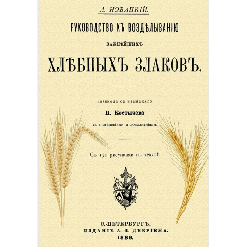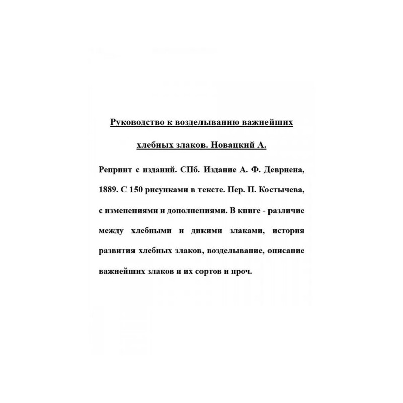 Руководство к возделыванию важнейших хлебных злаков. Новацкий А. Репринт с изданий. СПб. Издание А. Ф. Девриена, 1889. С 150 рисунками в тексте. Пер. П. Костычева, с изменениями и дополнениями. В книге - различие между хлебными и дикими злаками, история развития хлебных злаков, возделывание, описание важнейших злаков и их сортов и проч.