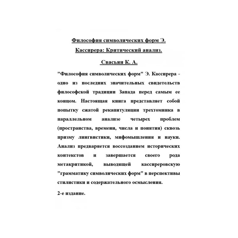 Философия символических форм Э. Кассирера: Критический анализ. Свасьян К. А. "Философия символических форм" Э. Кассирера - одно из последних значительных свидетельств философской традиции Запада перед самым ее концом. Настоящая книга представляет собой попытку сжатой рекапитуляции трехтомника в параллельном анализе четырех проблем (пространства, времени, числа и понятия) сквозь призму лингвистики, мифомышления и науки. Анализ предваряется воссозданием исторических контекстов и завершается своего рода метакритикой, выводящей кассиреровскую "грамматику символических форм" в перспективы стилистики и содержательного осмысления.2-е издание.