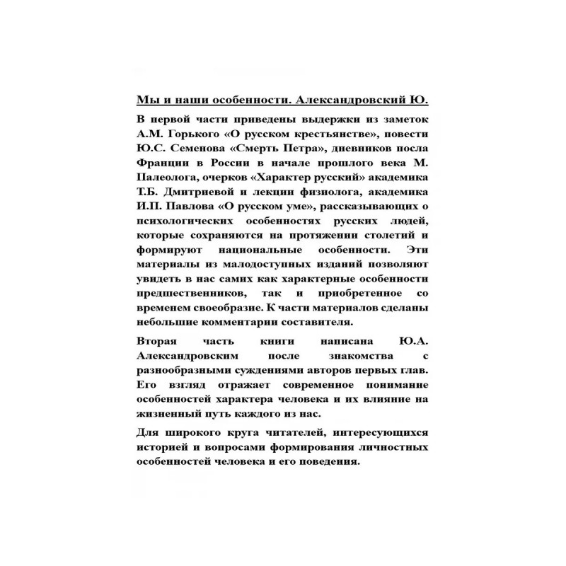 Мы и наши особенности. Александровский Ю. В первой части приведены выдержки из заметок А.М. Горького "О русском крестьянстве", повести Ю.С. Семенова "Смерть Петра", дневников посла Франции в России в начале прошлого века М. Палеолога, очерков "Характер русский" академика Т.Б. Дмитриевой и лекции физиолога, академика И.П. Павлова "О русском уме", рассказывающих о психологических особенностях русских людей, которые сохраняются на протяжении столетий и формируют национальные особенности. Эти материалы из малодоступных изданий позволяют увидеть в нас самих как характерные особенности предшественников, так и приобретенное со временем своеобразие. К части материалов сделаны небольшие комментарии составителя.Вторая часть книги написана Ю.А. Александровским после знакомства с разнообразными суждениями авторов первых глав. Его взгляд отражает современное понимание особенностей характера человека и их влияние на жизненный путь каждого из нас.Для широкого круга читателей, интересующихся историей и вопросами формирования личностных особенностей человека и его поведения.