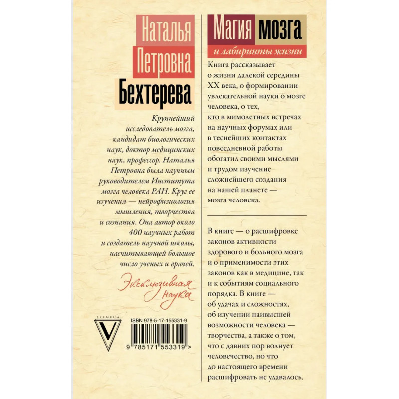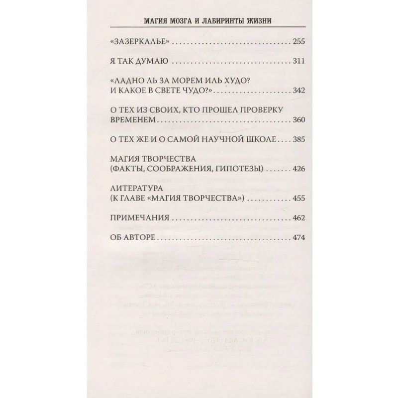Наталья Петровна Бехтерева крупнейший исследователь мозга, кандидат биологических наук, доктор медицинских наук, профессор. Наталья Петровна была научным руководителем Института мозга человека РАН. Круг ее изучения нейрофизиология мышления, творчества и сознания. Она автор около 400 научных работ и создатель научной школы, насчитывающей большое число ученых и врачей. Книга "Магия мозга и лабиринты жизни" рассказывает о жизни далекой середины XX века, о формировании увлекательной науки о мозге человека, о тех, кто в мимолетных встречах на научных форумах или в теснейших контактах повседневной работы обогатил своими мыслями и трудом изучение сложнейшего создания на нашей планете мозга человека. В книге "Магия мозга и лабиринты жизни" о расшифровке законов активности здорового и больного мозга и о применимости этих законов как в медицине, так и к событиям социального порядка. В книге об удачах и сложностях, об изучении наивысшей возможности человека творчества, а также о том, что с давних пор волнует человечество, но что до настоящего времени расшифровать не удавалось.