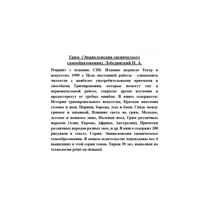 Грим. (Энциклопедия сценического самообразования). Лебединский П.А. Репринт с издания. СПб. Издание журнала Театр и искусство. 1909 г. Цель настоящей работы - ознакомить читателя с наиболее употребительными приемами и способами Гримирования, которые помогут ему в первоначальной работе, сократят время изучения и предостерегут от грубых ошибок. В книге содержатся: История гримировального искусства, Краткая анатомия головы и шеи, Парики, бороды, усы и баки, Связь между гримом и мимикой, Влияние света на грим, Молодое, детское и пожилое лицо, Налепки носа, Грим различных народов (Азия, Европа, Африка, Австралия), Прически различных народов разных эпох, и др. В книга содержит 200 рисунков в тексте. Серия: Энциклопедия сценического самообразования. В нашем издательстве переизданы все 6 вышедших в этой серии томов. Тираж 30 экз. выполнен по технологии print-on-demand.