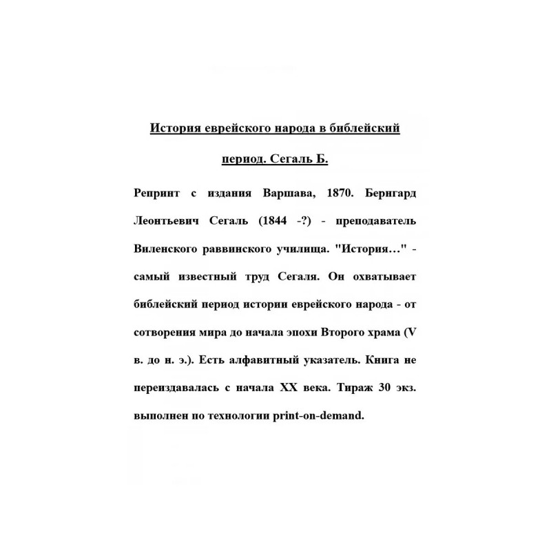 История еврейского народа в библейский период. Сегаль Б. Репринт с издания Варшава, 1870. Бернгард Леонтьевич Сегаль (1844 - ?)- преподаватель Виленского раввинского училища. "История" - самый известный труд Сегаля. Он охватывает библейский период истории еврейского народа - от сотворения мира до начала эпохи Второго храма (V в. до н. э. ). Есть алфавитный указатель. Книга не переиздавалась с начала XX века. Тираж 30 экз. выполнен по технологии print-on-demand.