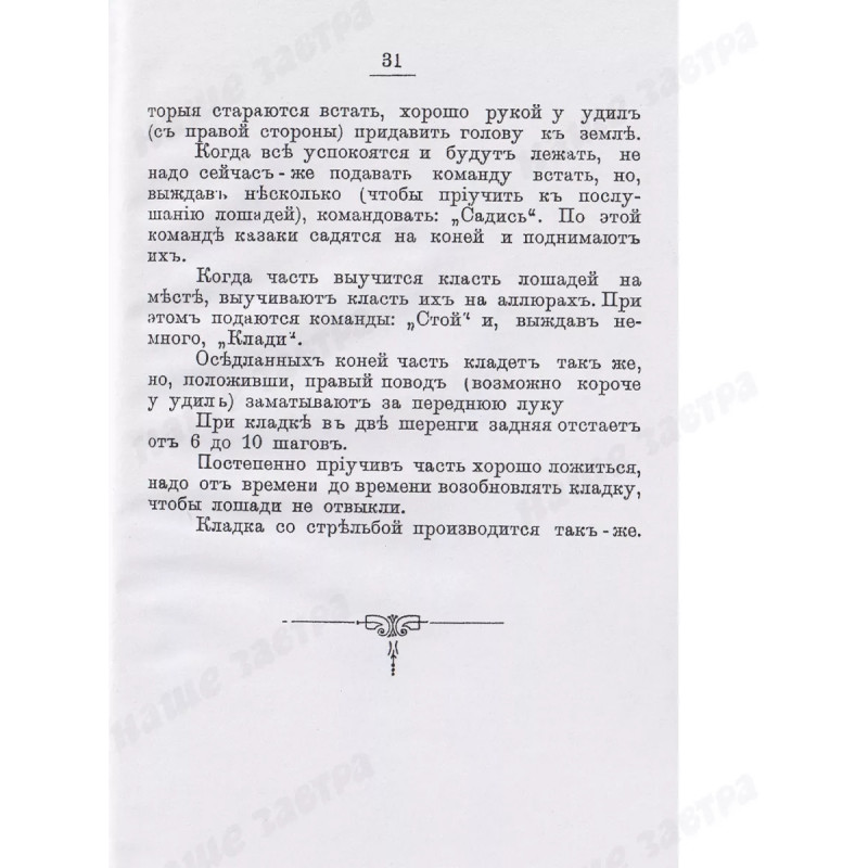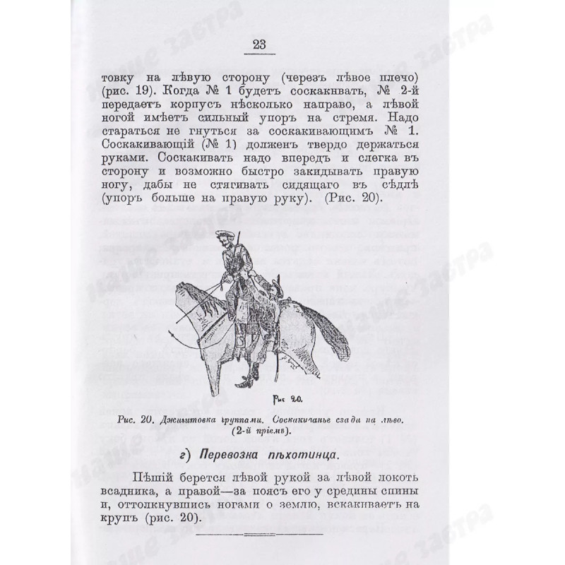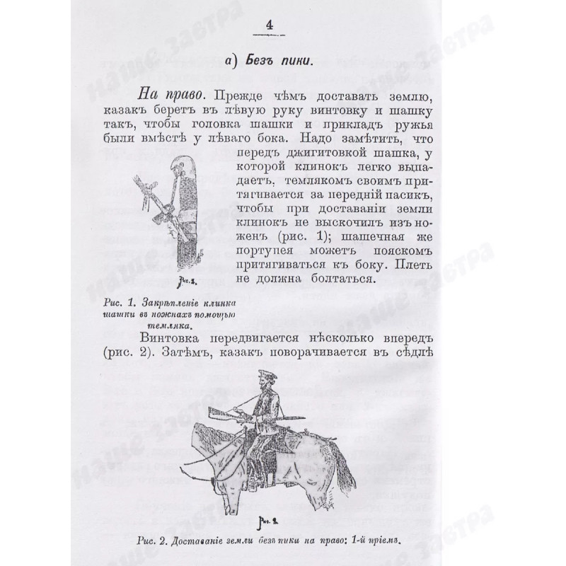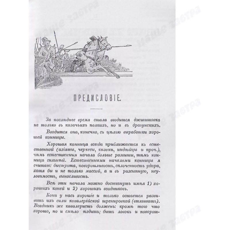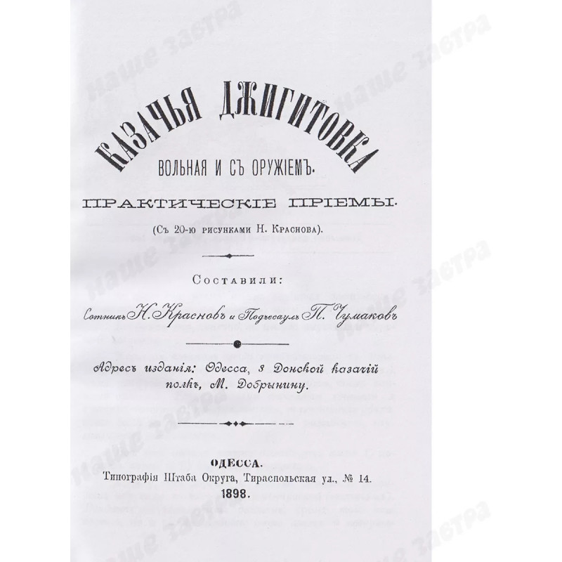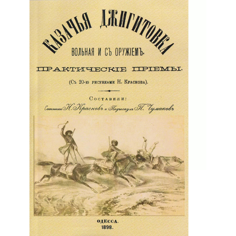 Казачья джигитовка вольная и с оружием: практические приемы. Краснов Н., Чумаков П. Репринт с издания. Одесса 1898. С 20 рис. автора. Рассказано о всех видах джигитовки с хитростями и методиками. Книга напечатана на русском языке с дореволюционной (дореформенной) орфографией.