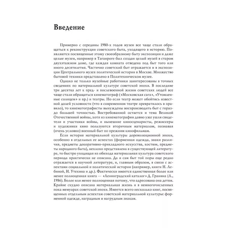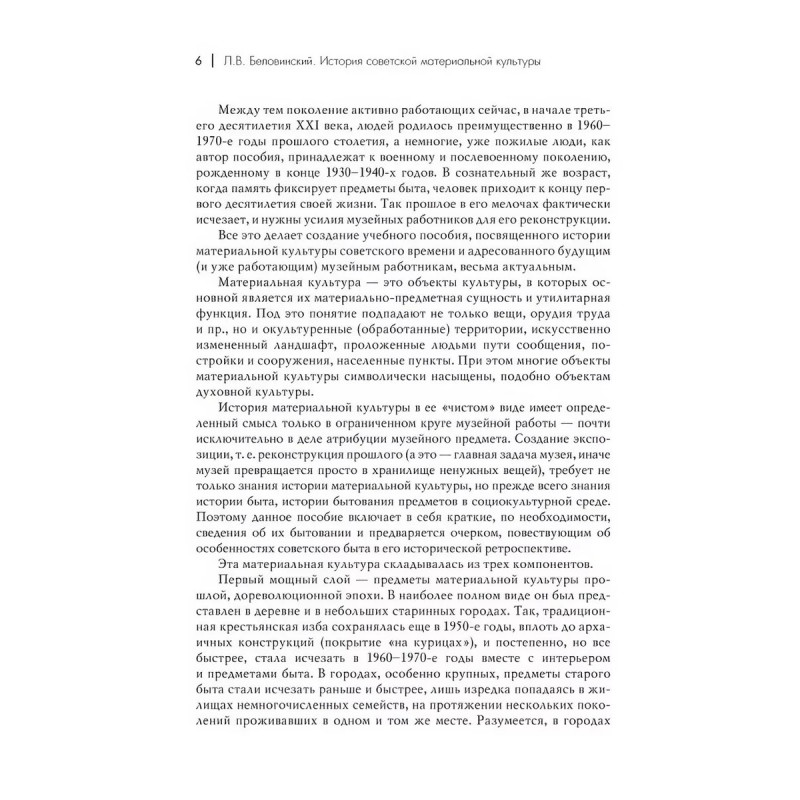 История советской материальной культуры. Беловинский Л. В. Материальная культура объекты культуры, в которых основной является их материально-предметная сущность и утилитарная функция. Под это понятие подпадают не только вещи, орудия труда и т. п., но и окультуренные территории, искусственно измененный ландшафт, проложенные людьми пути сообщения, постройки и сооружения, населенные пункты. При этом многие объекты материальной культуры символически насыщены, подобно объектам духовной культуры. Бурное семидесятилетие советской истории породило в быту и материальной культуре широких масс ряд явлений, ранее не имевших места в дореволюционном обиходе. В этой книге читатель найдет описание всего предметного мира, окружавшего наших соотечественников на протяжении советской истории. Предметы показаны в процессе их бытования в социокультурной среде, и таким образом делается переход к характеристике повседневной жизни человека. Книга являет собой пособие для студентов, обучающихся музейному делу, и музейных работников; может быть полезна режиссерам и художникам театра, кино и телевидения, а также как познавательное чтение широкому читателю, интересующемуся недавним прошлым своей страны