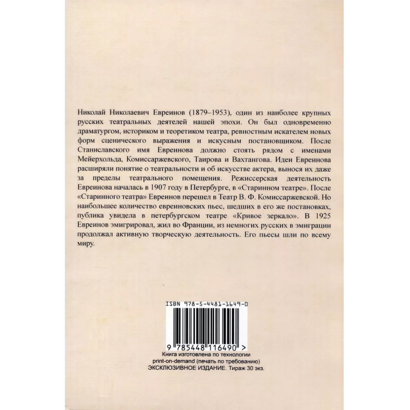 Демон театральности. Евреинов Н. Н. Николай Николаевич Евреинов (18791953), один из наиболее крупных русских театральных деятелей нашей эпохи. Он был одновременно драматургом, историком и теоретиком театра, ревностным искателем новых форм сценического выражения и искусным постановщиком. После Станиславского имя Евреинова должно стоять рядом с именами Мейерхольда, Комиссаржевского, Таирова и Вахтангова. Режиссерская деятельность Евреинова началась в 1907 году в Петербурге, в "Старинном театре". После "Старинного театра" Евреинов перешел в Театр В. Ф. Комиссаржевской. Но наибольшее количество евреиновских пьес, шедших в его же постановках, публика увидела в петербургском театре "Кривое зеркало". В 1925 Евреинов эмигрировал, жил во Франции, из немногих русских в эмиграции продолжал активную творческую деятельность. Евреинов считал, что русский театр с елизаветинских времен "был долгие годы русским лишь по названию да разве еще потому, что находился в России и на сцене его говорили и пели по-русски". По его мнению, "до первой трети XIX века были лишь отдельные, да и то лишь частичные, попытки русифицирования нашего драматического искусства". И вообще: "Что этот театр был навязан народу извне, как плод иноземной культуры, и, в своем дальнейшем развитии, оставался, на главнейших путях своих, театром заимствованным с Запада и явно подражающим его образцам, доказывается чуть ли не всей историей театра в России". А вот театральные обряды в языческой и полуязыческой Руси это подлинно русское. Он усматривал начало русского театра "в обрядово-драматических действиях, достигших у русского народа огромной выразительности и оригинальной художественной формы". Книга, впервые вышедшая в 1947 г. об истории русской драмы дополнена статьями о русской опере и русском балете. Автор дал краткие, но выразительные, характеристики известным ему режиссерам и актерам. Тираж 30 экз. выполнен по технологии print-on-demand.