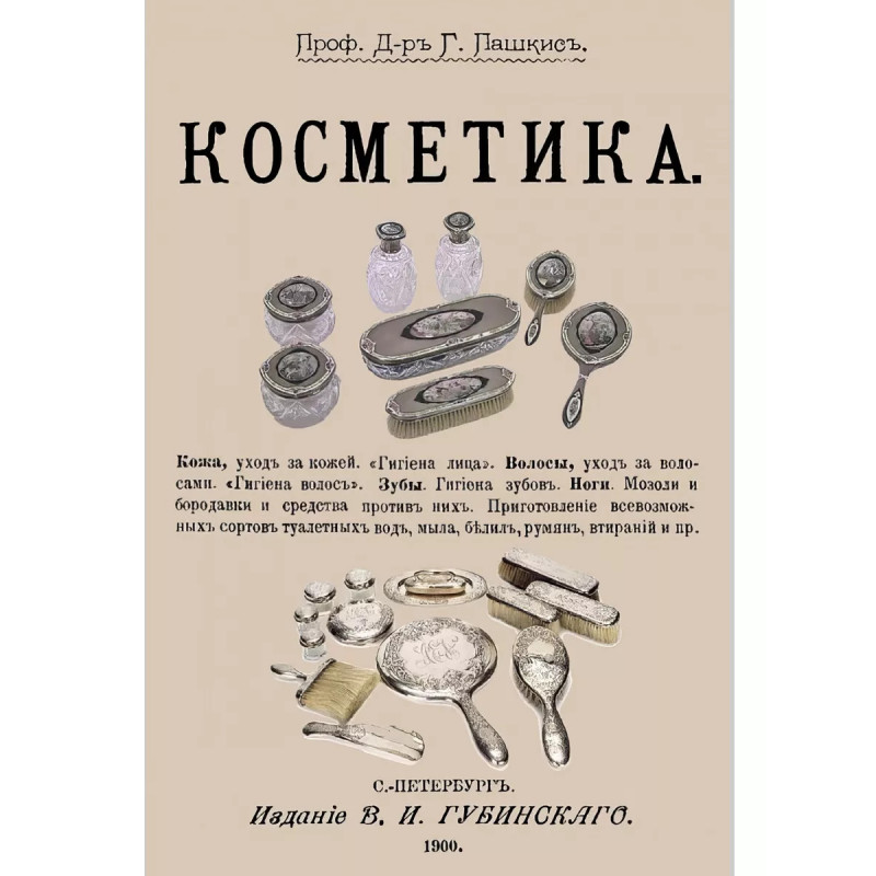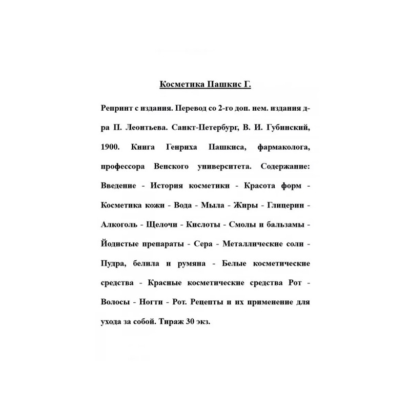 Косметика Пашкис Г. Репринт с издания. Перевод со 2-го доп. нем. издания д-ра П. Леонтьева. Санкт-Петербург, В. И. Губинский, 1900. Книга Генриха Пашкиса, фармаколога, профессора Венского университета. Содержание: Введение - История косметики - Красота форм - Косметика кожи - Вода - Мыла - Жиры - Глицерин - Алкоголь - Щелочи - Кислоты - Смолы и бальзамы - Йодистые препараты - Сера - Металлические соли - Пудра, белила и румяна - Белые косметические средства - Красные косметические средства Рот - Волосы - Ногти - Рот. Рецепты и их применение для ухода за собой. Тираж 30 экз.