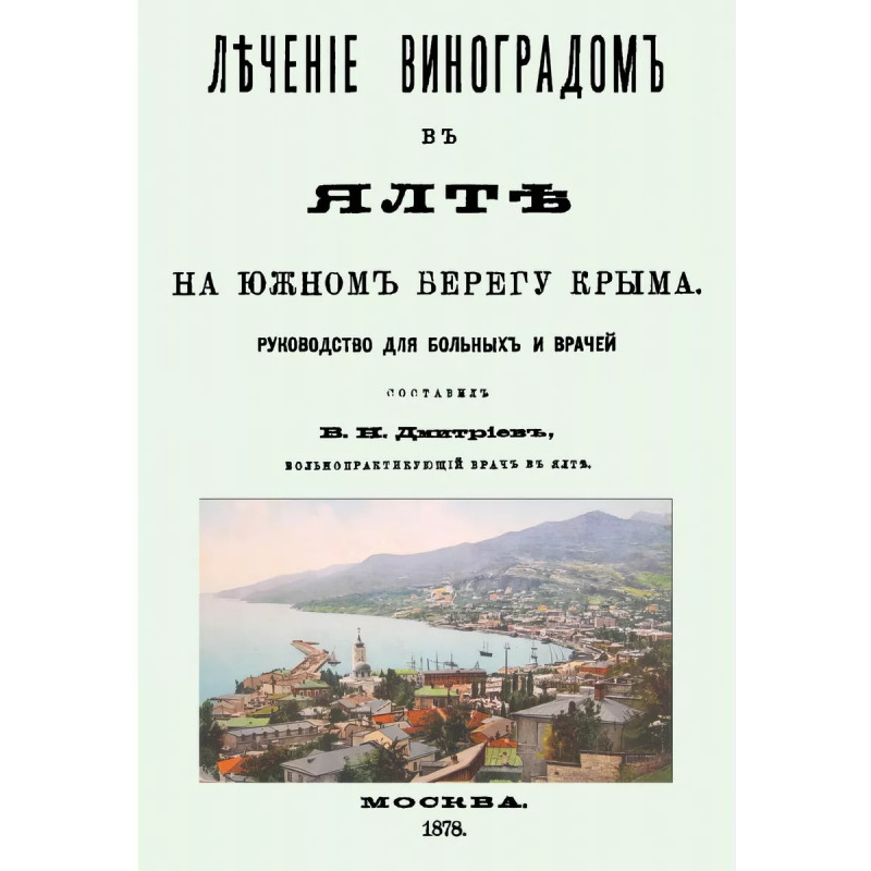 Лечение виноградом в Ялте. Дмитриев В. Н. Репринт с издания. Москва, 1878. Дмитриев - основоположник ампелотерапии (от греч. ampelos - виноград). В 1886 г. он первым выдвинул идею, подтвержденную впоследствии научными исследованиями, что виноград нормализует ритм сердечных сокращений и артериальное давление. Содержание: Краткий исторический очерк лечения виноградом; Виноград и виноградарство в Крыму; Химичесаий состав винограда; Физиологическое действие винограда; Болезни, в которых виноградное лечение оказывало пользу; Способы лечения виноградом и лечебные сорта винограда; Несколько слов об Ялте, как месте лечепия виноградом. Дмитриев Владимир Николаевич (1838 - 1904) - русский врач, климатолог и пионер виноградолечения, общественный деятель. Служил в Российском императорском флоте корабельным врачом. Выйдя в отставку, Дмитриев возвратился в Москву и поступил в клинику С. П. Боткина. К 1867 году его здоровье ухудшилось и по рекомендации С. П. Боткина он переехал в Ялту. Дмитриев доказал врачебной общественности, что Южный берег Крыма по климатическим условиям ничуть не хуже средиземноморских курортов (Ниццы). В 1894 году он стал во главе экскурсионной работы на Южном берегу Крыма. Нами изданы книги Дмитриева: Кефир, Лечение морскими купаниями в Ялте и вообще на Южном берегу Крыма. Тираж 30 экз. выполнен по технологии print-on-demand.