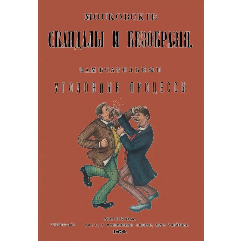 Московские скандалы и безобразия. Репринт с издания. Москва, 1870. В книге описываются "замечательные уголовные процессы в окружном суде и у мировых судей", а попросту всевозможные скандалы и именно безобразия гуляющих мещан и купцов. Содержание: "Дело о купце Э. В. Трузе, обвинявшемся в учинении драки в пьяном виде в трактире "Эрмитаж", "Дело об окрашении прусского подданного Гельдмахера фуксином", "Дело об адъютанте Московского генерал-губернатора, гвардии штабс-ротмистре, князе Э. М. Урусове, обвинявшемся в оскорблении действием студента Павла Кистера и в угрозе отрубить ему голову", "Дело об оскорблении действием чиновником канцелярии гражданского губернатора Н. М. Щепотьевым сотрудника журнала "Развлечение" коллежского секретаря Акилова и о произведении им же, Щепотьевым, беспорядка в коридоре московского Большого театра" и т. д. Всего 40 дел.