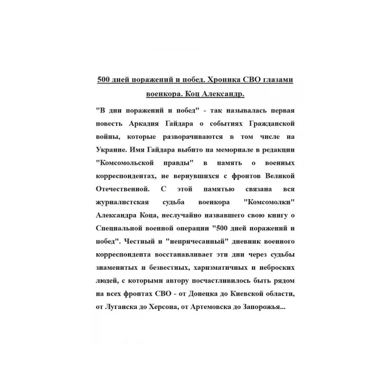 500 дней поражений и побед. Хроника СВО глазами военкора. Коц Александр. "В дни поражений и побед" - так называлась первая повесть Аркадия Гайдара о событиях Гражданской войны, которые разворачиваются в том числе на Украине. Имя Гайдара выбито на мемориале в редакции "Комсомольской правды" в память о военных корреспондентах, не вернувшихся с фронтов Великой Отечественной. С этой памятью связана вся журналистская судьба военкора "Комсомолки" Александра Коца, неслучайно назвавшего свою книгу о Специальной военной операции "500 дней поражений и побед". Честный и "непричесанный" дневник военного корреспондента восстанавливает эти дни через судьбы знаменитых и безвестных, харизматичных и неброских людей, с которыми автору посчастливилось быть рядом на всех фронтах СВО - от Донецка до Киевской области, от Луганска до Херсона, от Артемовска до Запорожья...