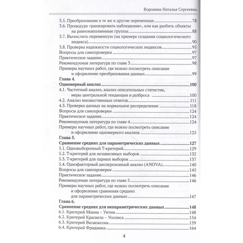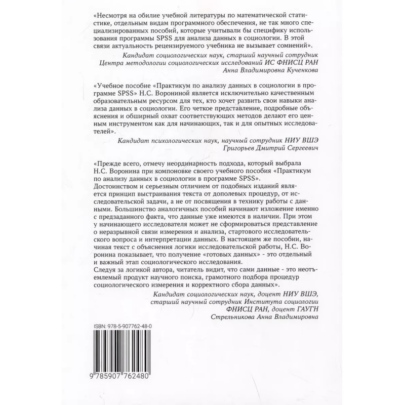 Практикум по анализу данных в социологии в программе SPSS. Воронина Н.С. Учебное пособие Практикум по анализу данных в социологии в программе SPSS Н. С. Ворониной, старшего научного сотрудника ИС фнисц РАН, представляет собой тщательно разработанное руководство по освоению анализа данных.Каждая из двенадцати глав посвящена определенному аспекту анализа данных, от базовых навыков до регрессионного и дискриминантного анализа, начинается с краткого введения, за которым следует пошаговая демонстрация соответствующих методов и процедур. Подробные объяснения в сочетании с практическими примерами позволяют читателям понять основные концепции и эффективно применять их в своих исследованиях.