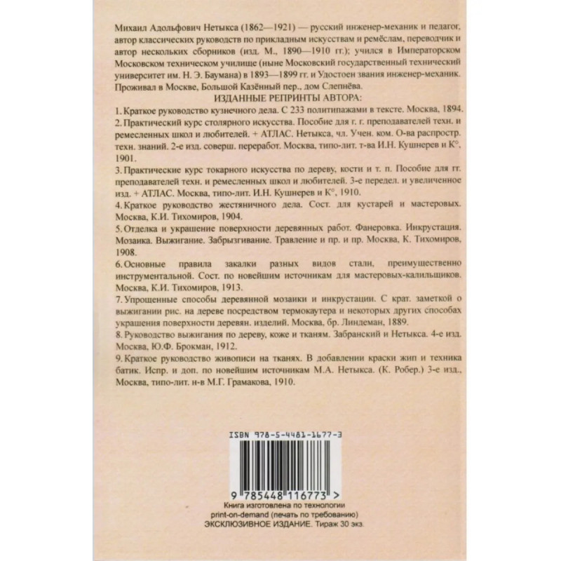 Краткое руководство живописи на тканях. Акварель, гуашь, масляные краски. В добавлении краски жип и техника батик. Нетыкса М.А. Эта книга репринт оригинального издания (издательство "Москва: типо-литография н-в М.Г. Грамакова", 1910 год), созданный на основе электронной копии высокого разрешения, которую очистили и обработали вручную, сохранив структуру и орфографию оригинального издания. Редкие, забытые и малоизвестные книги, изданные с петровских времен до наших дней, вновь доступны в виде печатных книг.Книга изготовлена по технологии print-on-demand(печать по требованию)Эксклюзивное издание. Тираж 30 экз.Книга напечатана на русском языке с дореволюционной (дореформенной) орфографией.
