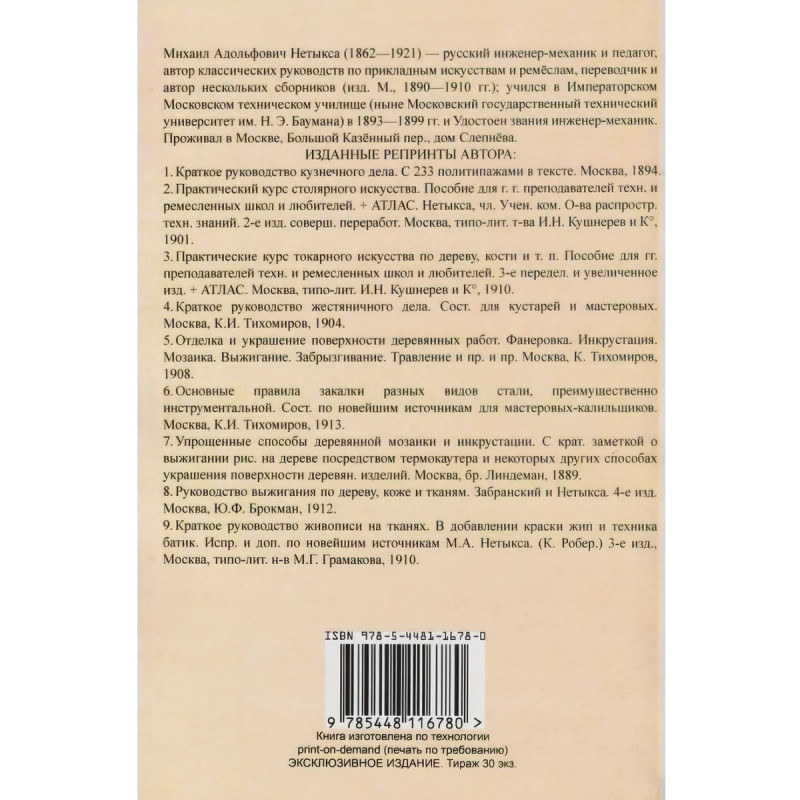 Краткое руководство кузнечного дела. Нетыкса М.А. Краткое руководство кузнечного дела, составленное для лиц, начинающих работать, а также технических и ремесленных школ.Книга изготовлена по технологии print-on-demand(печать по требованию)Эксклюзивное издание. Тираж 30 экз.Книга напечатана на русском языке с дореволюционной (дореформенной) орфографией.