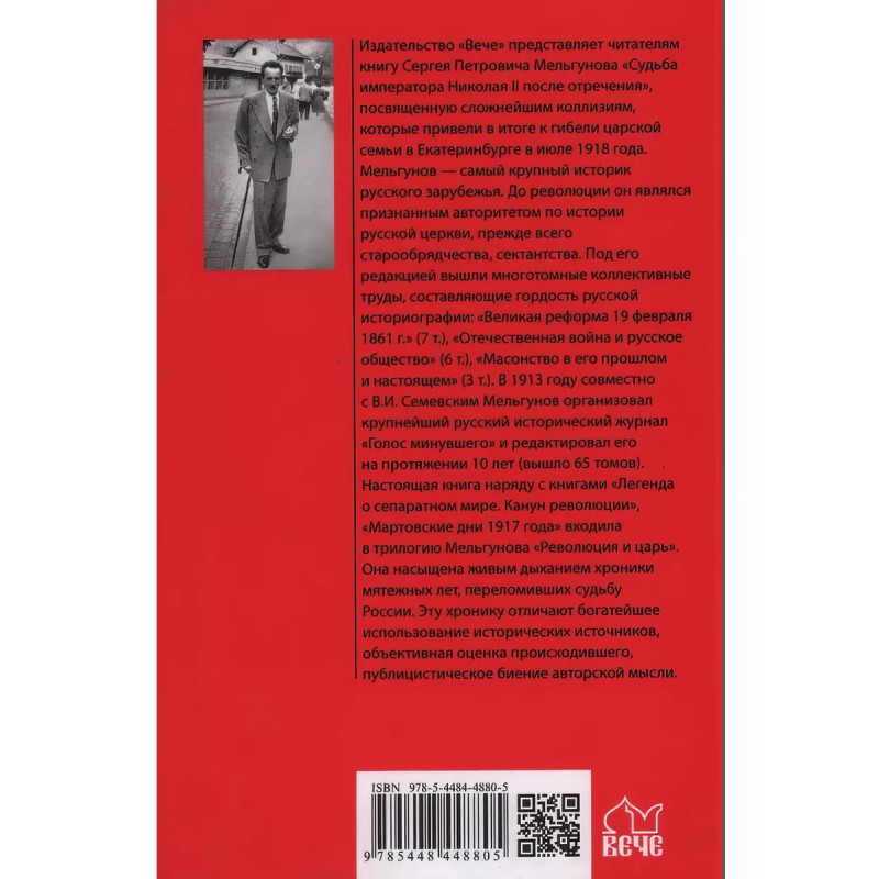 Судьба императора Николая II после отречения. Мельгунов С. П. Издательство Вече представляет читателям книгу Сергея Петровича Мельгунова Судьба императора Николая II после отречения, посвященную сложнейшим коллизиям, которые привели в итоге к гибели царской семьи в Екатеринбурге в июле 1918 года. Мельгунов самый крупный историк русского зарубежья. До революции он являлся признанным авторитетом по истории русской церкви, прежде всего старообрядчества, сектантства. Под его редакцией вышли многотомные коллективные труды, составляющие гордость русской историографии: Великая реформа 19 февраля 1861 г. (7 т.), Отечественная война и русское общество (6 т.), Масонство в его прошлом и настоящем (3 т.). В 1913 году совместно с В. И. Семевским Мельгунов организовал крупнейший русский исторический журнал Голос минувшего и редактировал его на протяжении 10 лет (вышло 65 томов). Настоящая книга наряду с книгами Легенда о сепаратном мире. Канун революции, Мартовские дни 1917 года входила в трилогию Мельгунова Революция и царь. Она насыщена живым дыханием хроники мятежных лет, переломивших судьбу России. Эту хронику отличают богатейшее использование исторических источников, объективная оценка происходившего, публицистическое биение авторской мысли.