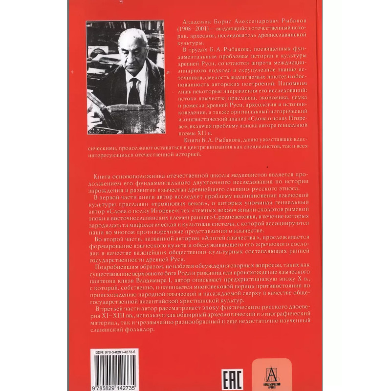 Язычество древней Руси. Рыбаков Б. А. Книга принадлежит перу выдающегося историка и археолога, знатока культуры древней и средневековой Руси академика Б. А. Рыбакова, основоположника отечественной школы медиевистов, и является продолжением его фундаментального двухтомного исследования по истории зарождения и развития язычества древнейшего славянорусского этноса. В первой части книги автор исследует проблему возникновения языческой культуры праславян "Трояновых веков", о которых упоминал гениальный автор "Слова о полку Игореве"; тех "темных веков" жизни сколотов римской эпохи и восточнославянских племен раннего Средневековья, в течение которых зародилась та мифологическая и культовая система, с которой ассоциируются наши во многом противоречивые представления о язычестве. Во второй части, названной автором "Апогей язычества", прослеживается формирование языческого культа и обслуживающего его жреческого сословия в качестве важнейших общественнокультурных составляющих ранней государственности древней Руси. Подробнейшим образом, не избегая обсуждения спорных вопросов, таких как существование верховного бога Рода и рожаниц или происхождение языческого пантеона князя Владимира I, автор описывает предхристианскую эпоху X в., с которой, собственно, и начинается многовековой период противостояния по происхождению народной языческой и насаждаемой сверху в качестве общегосударственной византийской христианской культур. В третьей части автор рассматривает эпоху фактического русского двоеверия XI-XIII вв., используя как обширный археологический и этнографический материал, так и чрезвычайно разнообразный и еще недостаточно изученный славянский фольклор.