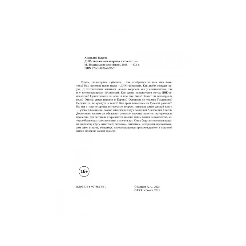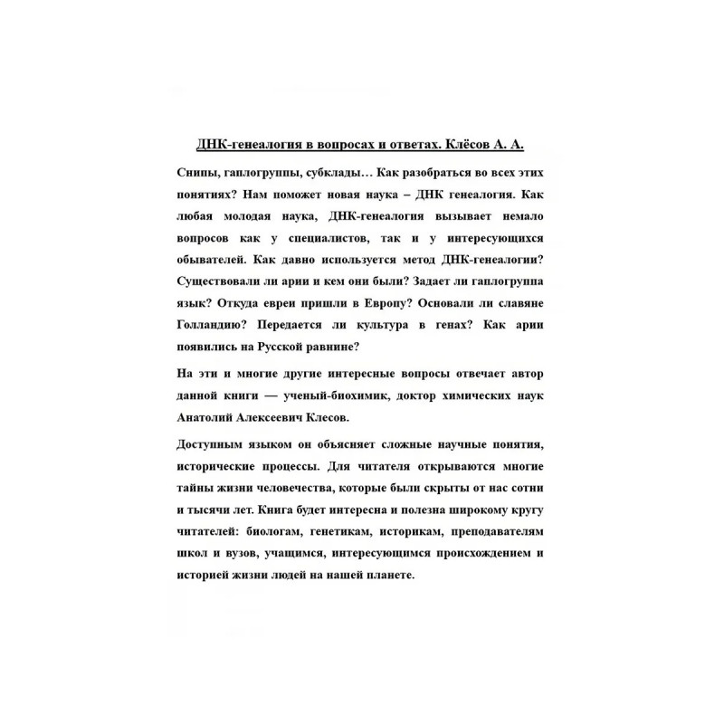 Различаются ли Россия, Украина и Белоруссия по своему родовому происхождению? Являются ли русские потомками финно-угров? Кого больше среди потомков скифов славян или тюрок? Был ли скандинавом (или шведом) по происхождению сын Александра Невского, Рюрикович? Правда ли, что в ДНК-генеалогии введен термин русы и показано, что они жили на Русской равнине 45 тысяч лет назад? На эти и другие вопросы вы найдете ответы в новой книге профессора Анатолия Клесова. В самом деле, с помощью ДНК-анализа можно заглянуть в далекое прошлое человечества. Десятки тысяч лет назад письменности не было, однако ДНК-анализ дает ответы на многие вопросы, относящиеся к древности и сохраняющие актуальности в наши дни. На страницах этой книги профессор Клесов приводит научные данные, сообщает о достижениях ДНК-генеалогии, рассказывает, в чем заключается суть метода.