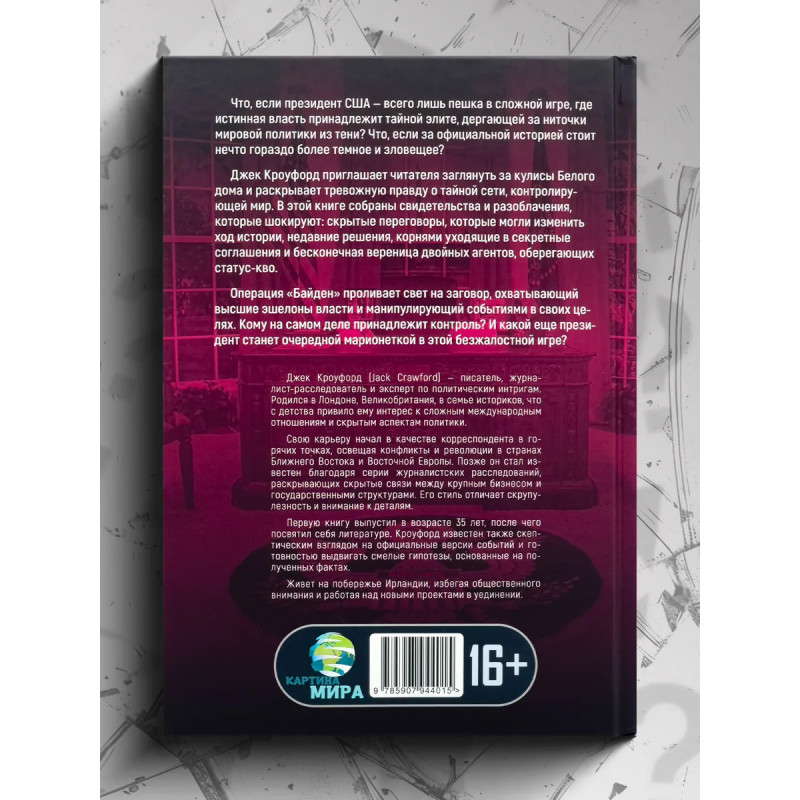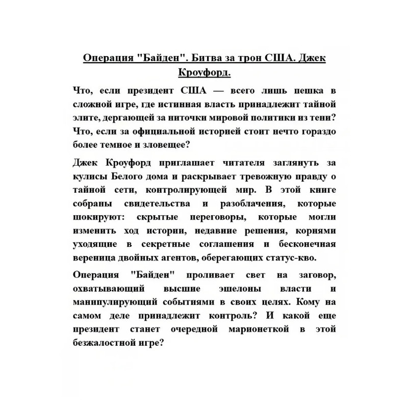 Операция "Байден". Битва за трон США. Джек Кроуфорд. Что, если президент США всего лишь пешка в сложной игре, где истинная власть принадлежит тайной элите, дергающей за ниточки мировой политики из тени? Что, если за официальной историей стоит нечто гораздо более темное и зловещее?Джек Кроуфорд приглашает читателя заглянуть за кулисы Белого дома и раскрывает тревожную правду о тайной сети, контролирующей мир. В этой книге собраны свидетельства и разоблачения, которые шокируют: скрытые переговоры, которые могли изменить ход истории, недавние решения, корнями уходящие в секретные соглашения и бесконечная вереница двойных агентов, оберегающих статус-кво. Операция "Байден" проливает свет на заговор, охватывающий высшие эшелоны власти и манипулирующий событиями в своих целях. Кому на самом деле принадлежит контроль? И какой еще президент станет очередной марионеткой в этой безжалостной игре?