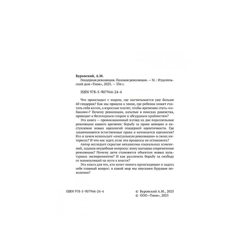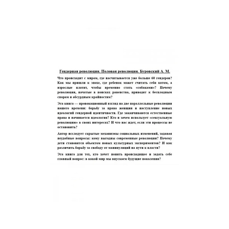 Гендерная революция. Половая революция. Буровский А. М. Что происходит с миром, где насчитывается уже больше 60 гендеров? Как мы пришли к эпохе, где ребенок может считать себя котом, а взрослые платят, чтобы временно стать собаками ? Почему революции, начатые в поисках равенства, приводят к бесплодным спорам и абсурдным крайностям? Эта книга провокационный взгляд на две параллельные революции нашего времени: борьбу за права женщин и наступление новых идеологий гендерной идентичности. Где заканчиваются естественные права и начинается идеология? Кто и зачем использует сексуальную революцию в своих интересах? И что нас ждет, если эти процессы не остановить? Автор исследует скрытые механизмы социальных изменений, задавая неудобные вопросы: кому выгодны современные революции? Почему дети становятся объектом новых культурных экспериментов? И как различить борьбу за свободу от манипуляций на пути к власти? Эта книга для тех, кто хочет понять происходящее и задать себе главный вопрос: в какой мир мы впускаем будущие поколения?