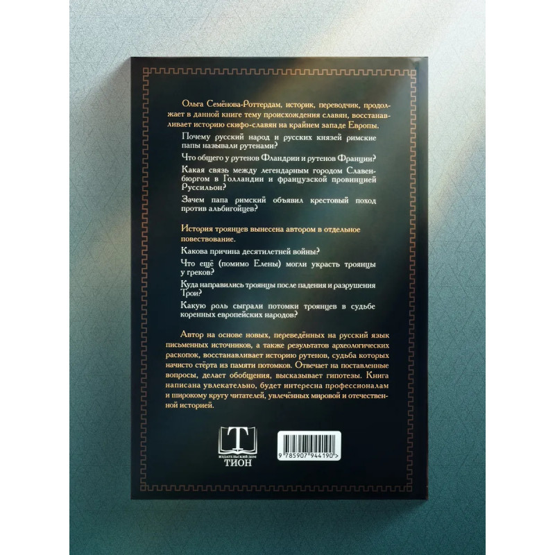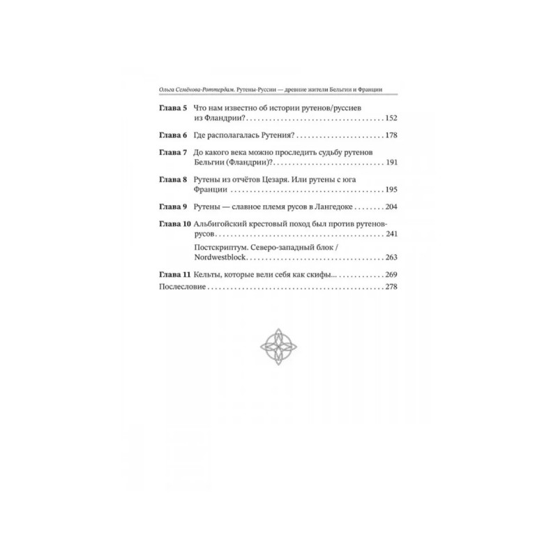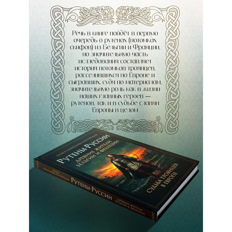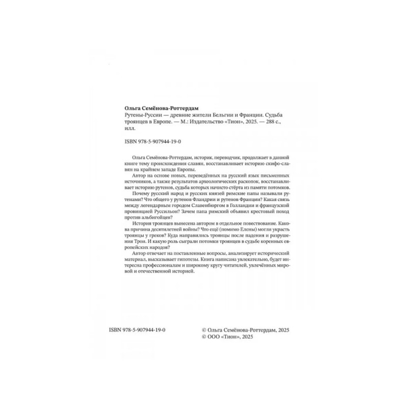 Рутены-Руссии - древние жители Бельгии и Франции. Судьба троянцев в Европе. Семёнова-Роттердам О. Ольга Семёнова-Роттердам, историк, переводчик, продолжает в данной книге тему происхождения славян, восстанавливает историю скифо-славян на крайнем западе Европы. Автор на основе новых, переведённых на русский язык письменных источников, а также результатов археологических раскопок, восстанавливает историю рутенов, судьба которых начисто стёрта из памяти потомков. Почему русский народ и русских князей римские папы называли рутенами? Что общего у рутенов Фландрии и рутенов Франции? Какая связь между легендарным городом Славенбюргом в Голландии и французской провинцией Руссильон? Зачем папа римский объявил крестовый поход против альбигойцев?История троянцев вынесена автором в отдельное повествование. Какова причина десятилетней войны? Что ещё (помимо Елены) могли украсть троянцы у греков? Куда направились троянцы после падения и разрушения Трои. И какую роль сыграли потомки троянцев в судьбе коренных европейских народов?Автор отвечает на поставленные вопросы, анализирует исторический материал, высказывает гипотезы. Книга написана увлекательно, будет интересна профессионалам и широкому кругу читателей, увлечённых мировой и отечественной историе