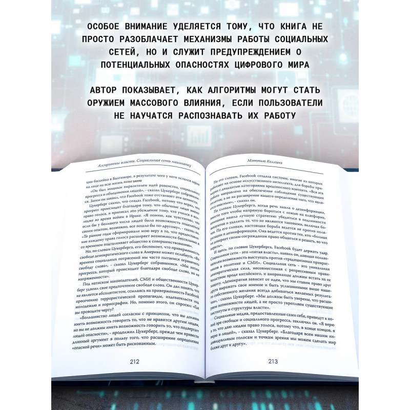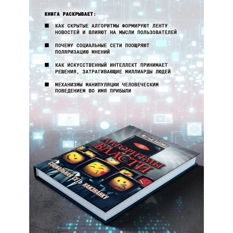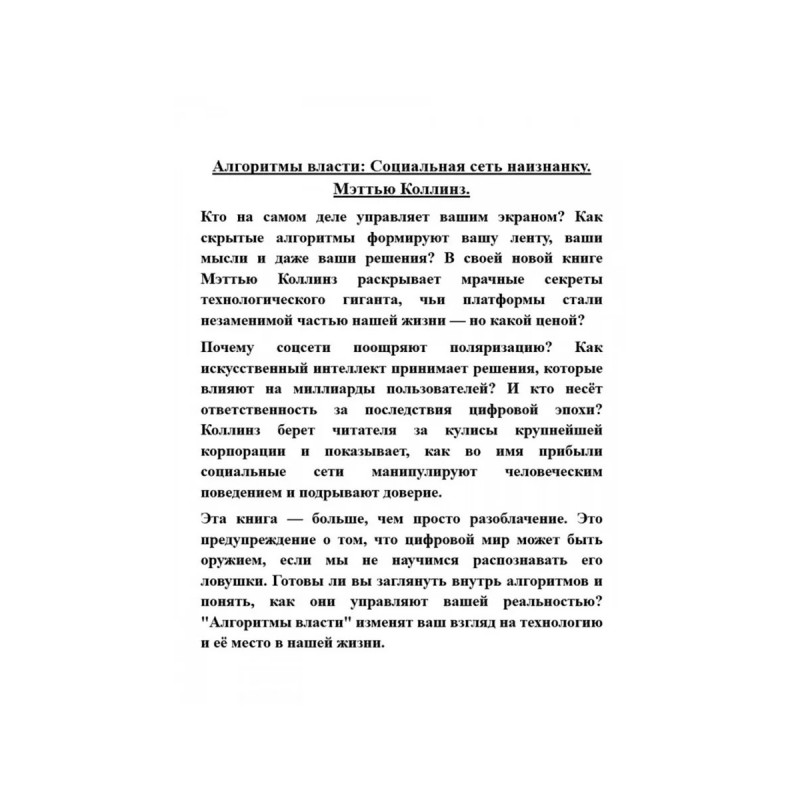 Алгоритмы власти: Социальная сеть наизнанку. Мэттью Коллинз. Кто на самом деле управляет вашим экраном? Как скрытые алгоритмы формируют вашу ленту, ваши мысли и даже ваши решения? В своей новой книге Мэттью Коллинз раскрывает мрачные секреты технологического гиганта, чьи платформы стали незаменимой частью нашей жизни но какой ценой?Почему соцсети поощряют поляризацию? Как искусственный интеллект принимает решения, которые влияют на миллиарды пользователей? И кто несёт ответственность за последствия цифровой эпохи? Коллинз берет читателя за кулисы крупнейшей корпорации и показывает, как во имя прибыли социальные сети манипулируют человеческим поведением и подрывают доверие. Эта книга больше, чем просто разоблачение. Это предупреждение о том, что цифровой мир может быть оружием, если мы не научимся распознавать его ловушки. Готовы ли вы заглянуть внутрь алгоритмов и понять, как они управляют вашей реальностью? "Алгоритмы власти" изменят ваш взгляд на технологию и её место в нашей жизни.