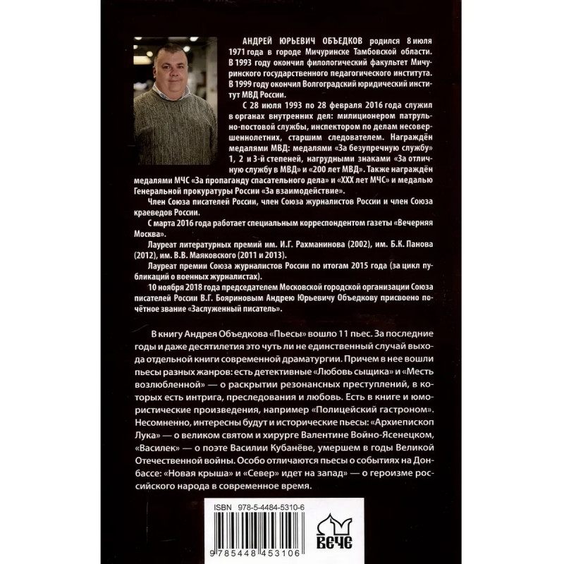 В книгу Андрея Объедкова "Пьесы" вошло 11 пьес. За последние годы и даже десятилетия это чуть ли не единственный случай выхода отдельной книги современной драматургии. Причем в нее вошли пьесы разных жанров: есть детективные "Любовь сыщика" и "Месть возлюбленной" о раскрытии резонансных преступлений, в которых есть интрига, преследования и любовь. Есть в книге и юмористические произведения, например "Полицейский гастроном". Несомненно, интересны будут и исторические пьесы: "Архиепископ Лука" о великом святом и хирурге Валентине ВойноЯсенецком, "Василек" о поэте Василии Кубанёве, умершем в годы Великой Отечественной войны. Особо отличаются пьесы о событиях на Донбассе: "Новая крыша" и "Север" идет на запад" о героизме российского народа в современное время.