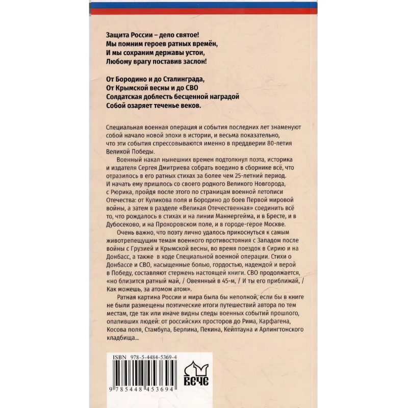Специальная военная операция и события последних лет знаменуют собой начало новой эпохи в истории, и весьма показательно, что эти события спрессовываются именно в преддверии 80-летия Великой Победы. Военный накал нынешних времен подтолкнул поэта, историка и издателя Сергея Дмитриева собрать воедино в сборнике всё, что отразилось в его ратных стихах за более чем 25-летний период. И начать ему пришлось со своего родного Великого Новгорода, с Рюрика, пройдя после этого по страницам военной летописи Отечества: от Куликова поля и Бородино до боев Первой мировой войны, а затем в разделе Великая Отечественная соединить всё то, что рождалось в стихах и на линии Маннергейма, и в Бресте, и в Дубосеково, и на Прохоровском поле, и в городе-герое Москве. Очень важно, что поэту лично удалось прикоснуться к самым животрепещущим темам военного противостояния с Западом после войны с Грузией и Крымской весны, во время поездок в Сирию и на Донбасс, а также в ходе Специальной военной операции. Стихи о Донбассе и СВО, насыщенные болью, гордостью, надеждой и верой в Победу, составляют стержень настоящей книги. СВО продолжается, но близится ратный май, / Овеянный в 45-м, / И ты его приближай, / Как можешь, за атомом атом. Ратная картина России и мира была бы не полной, если бы в книге не были размещены поэтические итоги путешествий автора по тем местам, где так или иначе видны следы военных событий прошлого, опаливших людей: от российских просторов до Рима, Карфагена, Косова поля, Стамбула, Берлина, Пекина, Кейптауна и Арлингтонского кладбища.