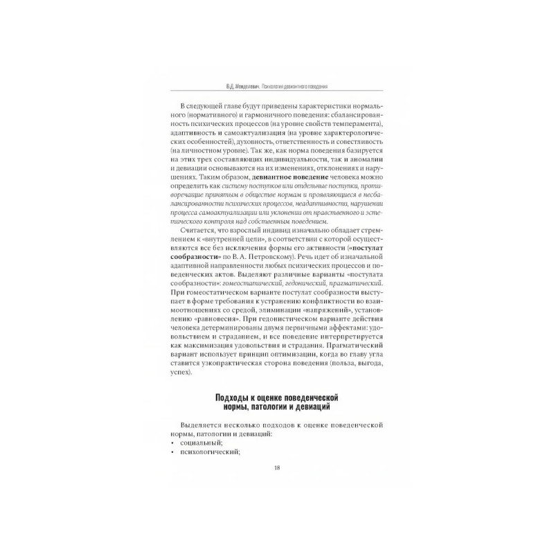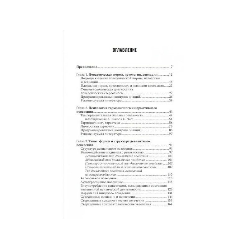 В учебном пособии представлены основные разделы психологии девиантного поведения, охватывающие описание нормативного, гармоничного, идеального поведения, а также структуры, типов и клинических форм отклоняющегося поведения у детей, подростков и взрослых. Приведены критерии пяти отклоняющихся поведенческих типов (делинквентного, аддиктивного, патохарактерологического, психопатологического и на базе гиперспособностей) в форме агрессивного, аутоагрессивного, суицидального поведения, нарушений пищевого поведения, сексуальных девиаций и перверсий, алкогольной и наркотической зависимостей, сверхценных психологических и психопатологических увлечений, коммуникативных девиаций и др. Отдельные главы посвящены культуральным, гендерным, возрастным и профессиональным девиациям, а также отклоняющемуся поведениюхронически больных. Приводятся описания основ комплексной терапии и коррекции поведенческих девиаций.