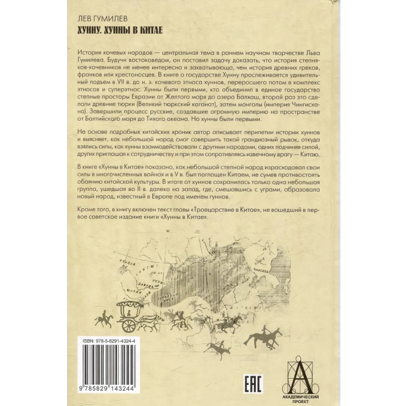 История кочевых народов центральная тема в раннем научном творчестве Льва Гумилева. Будучи востоковедом, он поставил задачу доказать, что история степняков-кочевников не менее интересна и захватывающа, чем история древних греков, франков или крестоносцев. В книге о государстве Хунну прослеживается удивительный подъем в VII в. до н. э. кочевого этноса хуннов, переросшего потом в комплекс этносов и суперэтнос. Хунны были первыми, кто объединил в единое государство степные просторы Евразии от Желтого моря до озера Балхаш, второй раз это сделали древние тюрки (Великий тюркский каганат), затем монголы (империя Чингисхана). Завершили процесс русские, создавшие огромную империю на пространстве от Балтийского моря до Тихого океана. Но хунны были первыми. На основе подробных китайских хроник автор описывает перипетии истории хуннов и выясняет, как небольшой народ смог совершить такой грандиозный рывок, откуда взялись силы, как хунны взаимодействовали с другими народами, одних подчиняя силой, других приглашая к сотрудничеству и при этом сопротивляясь извечному врагу Китаю. В книге Хунны в Китае показано, как небольшой степной народ израсходовал свои силы в многочисленных войнах и в V в. был поглощен Китаем, не сумев противостоять обаянию китайской культуры. В итоге от хуннов сохранилась только одна небольшая группа, ушедшая во II в. далеко на запад, где, смешавшись с уграми, образовала новый народ, известный в Европе под именем гуннов. Кроме того, в книгу включен текст главы Троецарствие в Китае, не вошедший в первое советское издание книги Хунны в КитаеАвтор вступительной статьи к книге Л. Н. Гyмилева "Хунну. Хунны в Китае" - доктор географических наук, профессор С. Б. Лавров. Книга снабжена синхронистической таблицей, списком литературы, указателем имен исторических лиц, указателем имен исследователей и цитируемых авторов, указателем географических названий . Книга адресована историкам, географам, философам, этнологам и широкому кругу заинтересованных читателей.