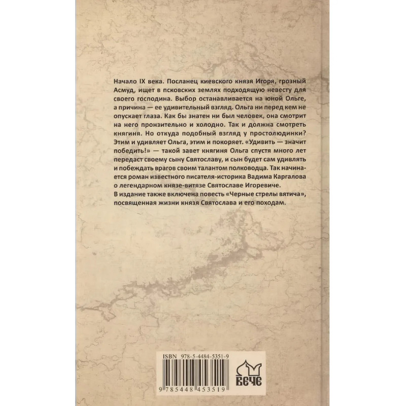 Начало IX века. Посланец киевского князя Игоря, грозный Асмуд, ищет в псковских землях подходящую невесту для своего господина. Выбор останавливается на юной Ольге, а причина ее удивительный взгляд. Ольга ни перед кем не опускает глаза. Как бы знатен ни был человек, она смотрит на него пронзительно и холодно. Так и должна смотреть княгиня. Но откуда подобный взгляд у простолюдинки? Этим и удивляет Ольга, этим и покоряет. Удивить значит победить! такой завет княгиня Ольга спустя много лет передаст своему сыну Святославу, и сын будет сам удивлять и побеждать врагов своим талантом полководца. Так начинается роман известного писателя-историка Вадима Каргалова о легендарном князе-витязе Святославе Игоревиче. В издание также включена повесть Черные стрелы вятича, посвященная жизни князя Святослава и его походам.
