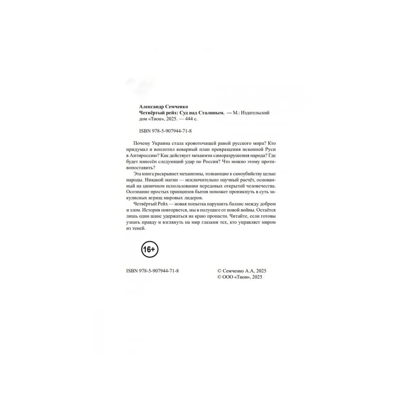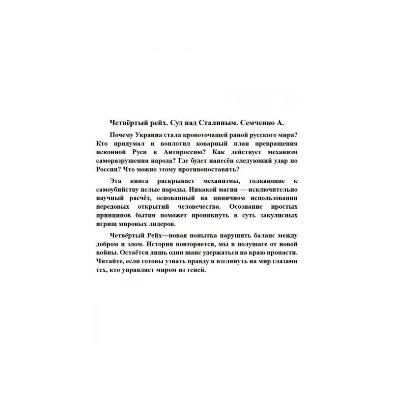 Четвёртый рейх. Суд над Сталиным. Семченко А. A. Почему Украина стала кровоточащей раной русского мира? Кто придумал и воплотил коварный план превращения исконной Руси в Антироссию? Как действует механизм саморазрушения народа? Где будет нанесён следующий удар по России? Что можно этому противопоставить? Эта книга раскрывает механизмы, толкающие к самоубийству целые народы. Никакой магии исключительно научный расчёт, основанный на циничном использовании передовых открытий человечества. Осознание простых принципов бытия поможет проникнуть в суть закулисных игрищ мировых лидеров. Четвёртый Рейхновая попытка нарушить баланс между добром и злом. История повторяется, мы в полушаге от новой войны. Остаётся лишь один шанс удержаться на краю пропасти. Читайте, если готовы узнать правду и взглянуть на мир глазами тех, кто управляет миром из теней.