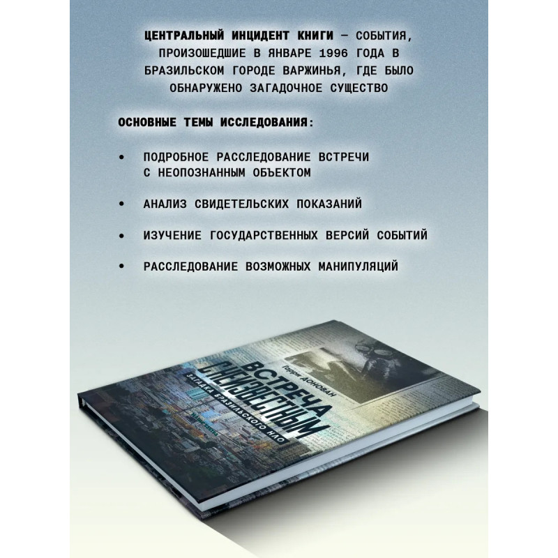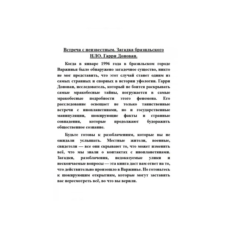 Встреча с неизвестным. Загадка бразильского НЛО. Гарри Донован. Когда в январе 1996 года в бразильском городе Варжинья было обнаружено загадочное существо, никто не мог представить, что этот случай станет одним из самых странных и спорных в истории уфологии. Гарри Донован, исследователь, который не боится раскрывать самые мракобесные тайны, погружается в самые мракобесные подробности этого феномена. Его расследование освещает не только таинственные встречи с инопланетянами, но и государственные манипуляции, шокирующие факты и странные совпадения, которые продолжают будоражить общественное сознание. Будьте готовы к разоблачениям, которые вы не ожидали услышать. Местные жители, военные, свидетели все они скрывают то, что может изменить всё, что мы знали о контактах с инопланетянами. Загадки, разоблачения, недоказуемые улики и нескончаемые вопросы эта книга даст вам ответ на то, что действительно произошло в Варжинье. Но готовьтесь к шокирующим открытиям, которые могут заставить вас пересмотреть всё, во что вы верили.
